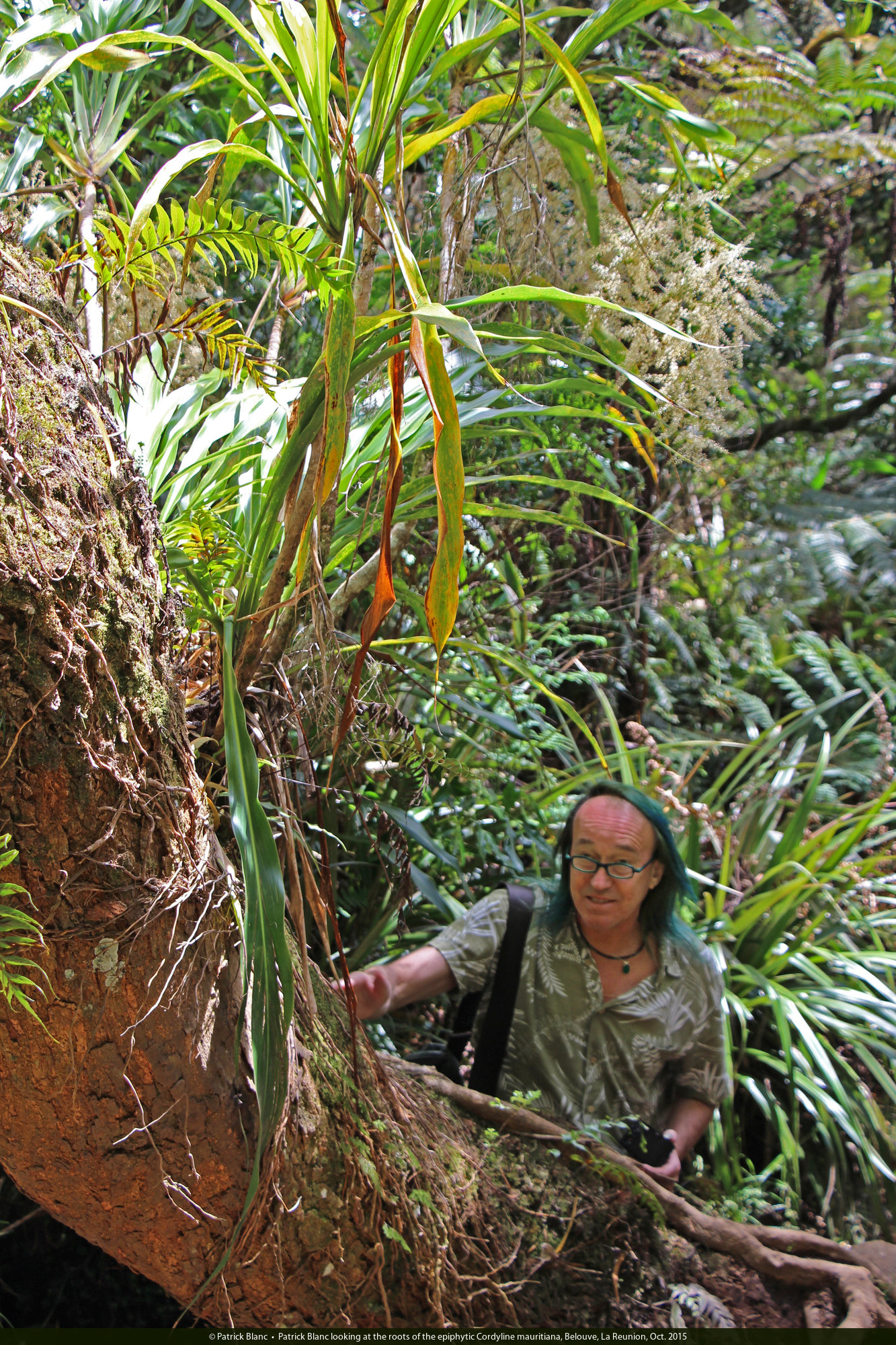 Patrick Blanc looking at the roots of the epiphytic Cordyline mauritiana, Belouve, La Reunion, Oct. 2015