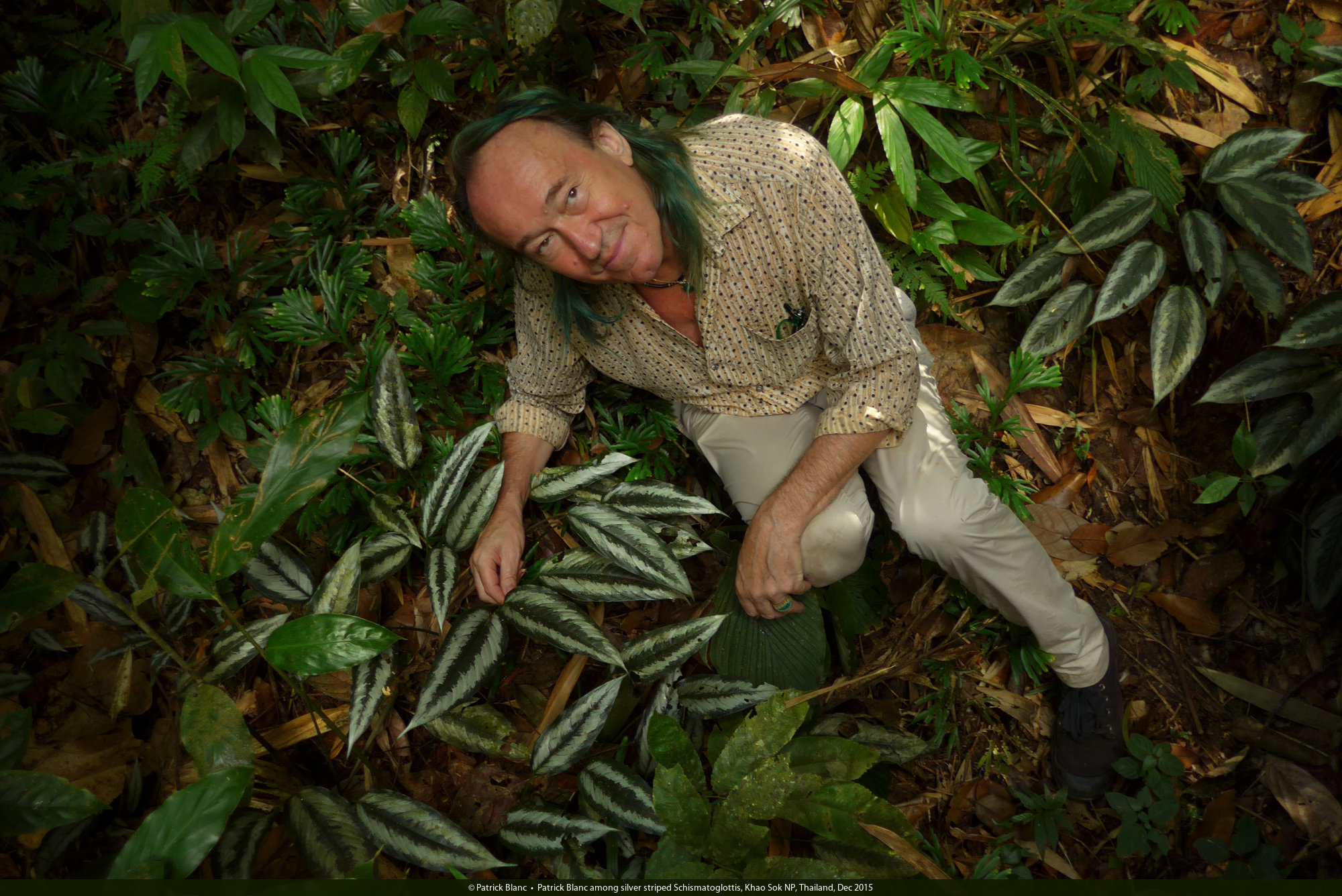 Patrick Blanc among silver striped Schismatoglottis, Khao Sok NP, Thailand, Dec 2015