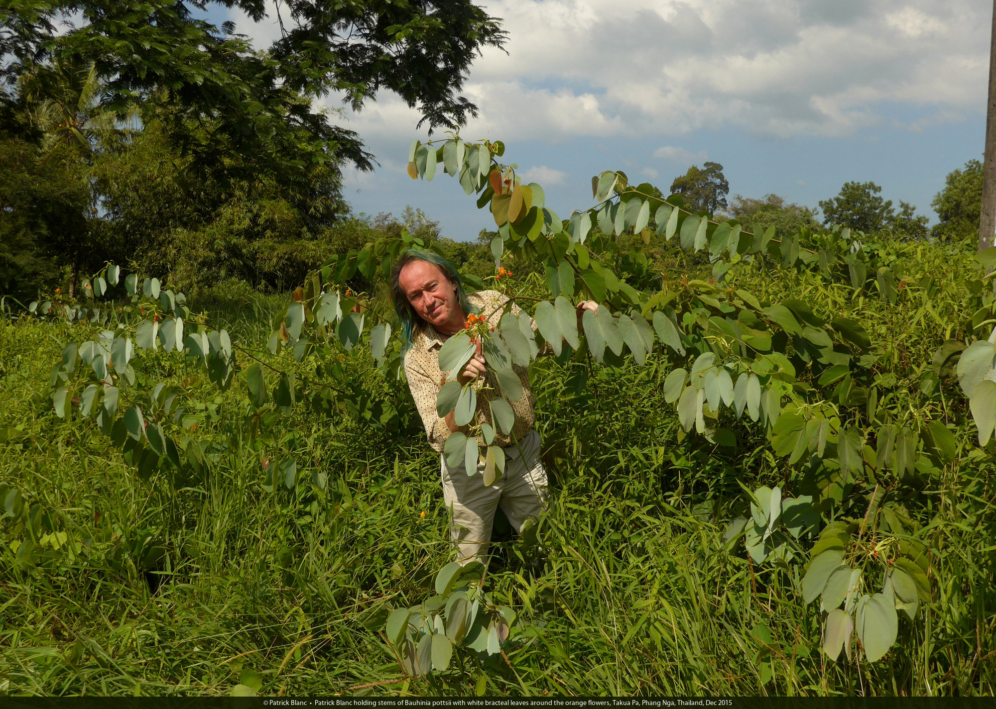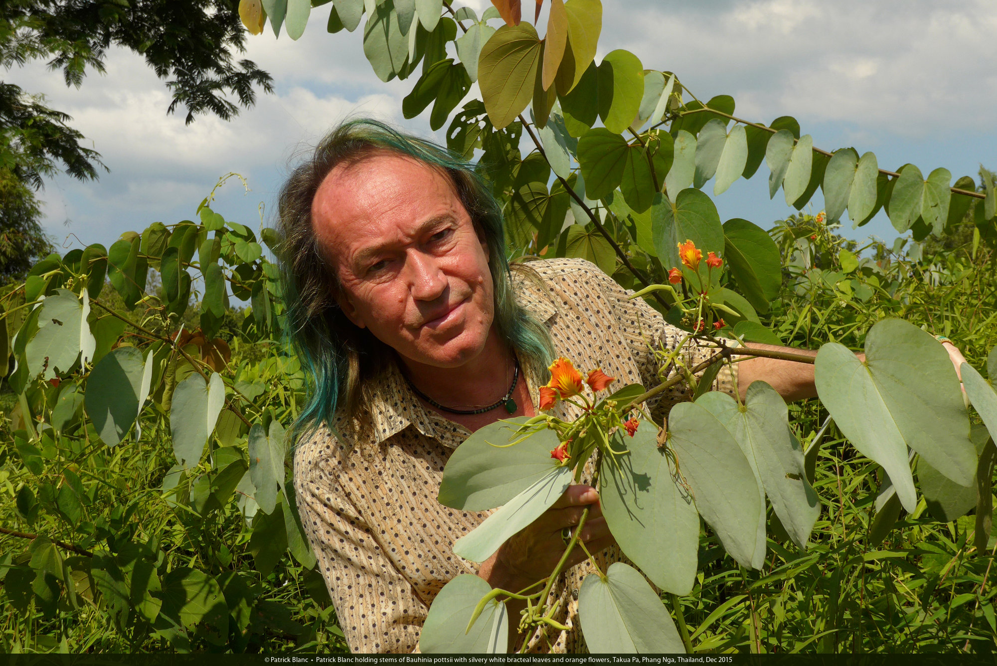 Patrick Blanc holding stems of Bauhinia pottsii with silvery white bracteal leaves and orange flowers, Takua Pa, Phang Nga, Thailand, Dec 2015