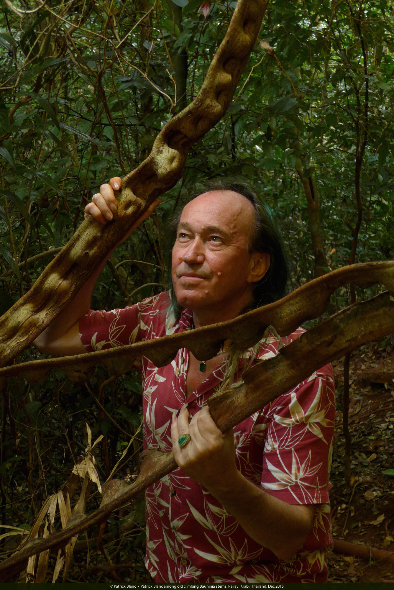 Patrick Blanc among old climbing Bauhinia stems, Railay, Krabi, Thailand, Dec 2015