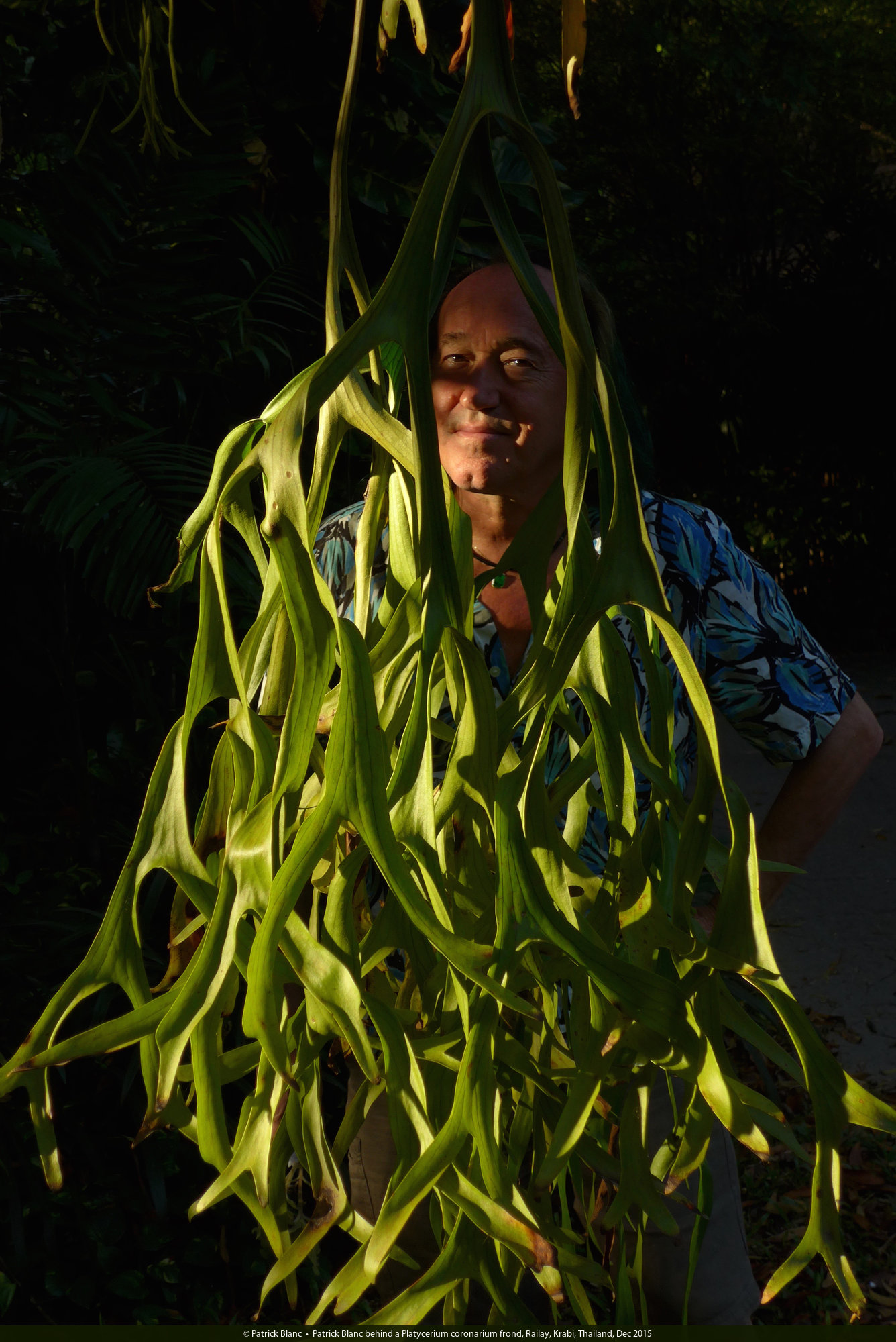 Patrick Blanc behind a Platycerium coronarium frond, Railay, Krabi, Thailand, Dec 2015