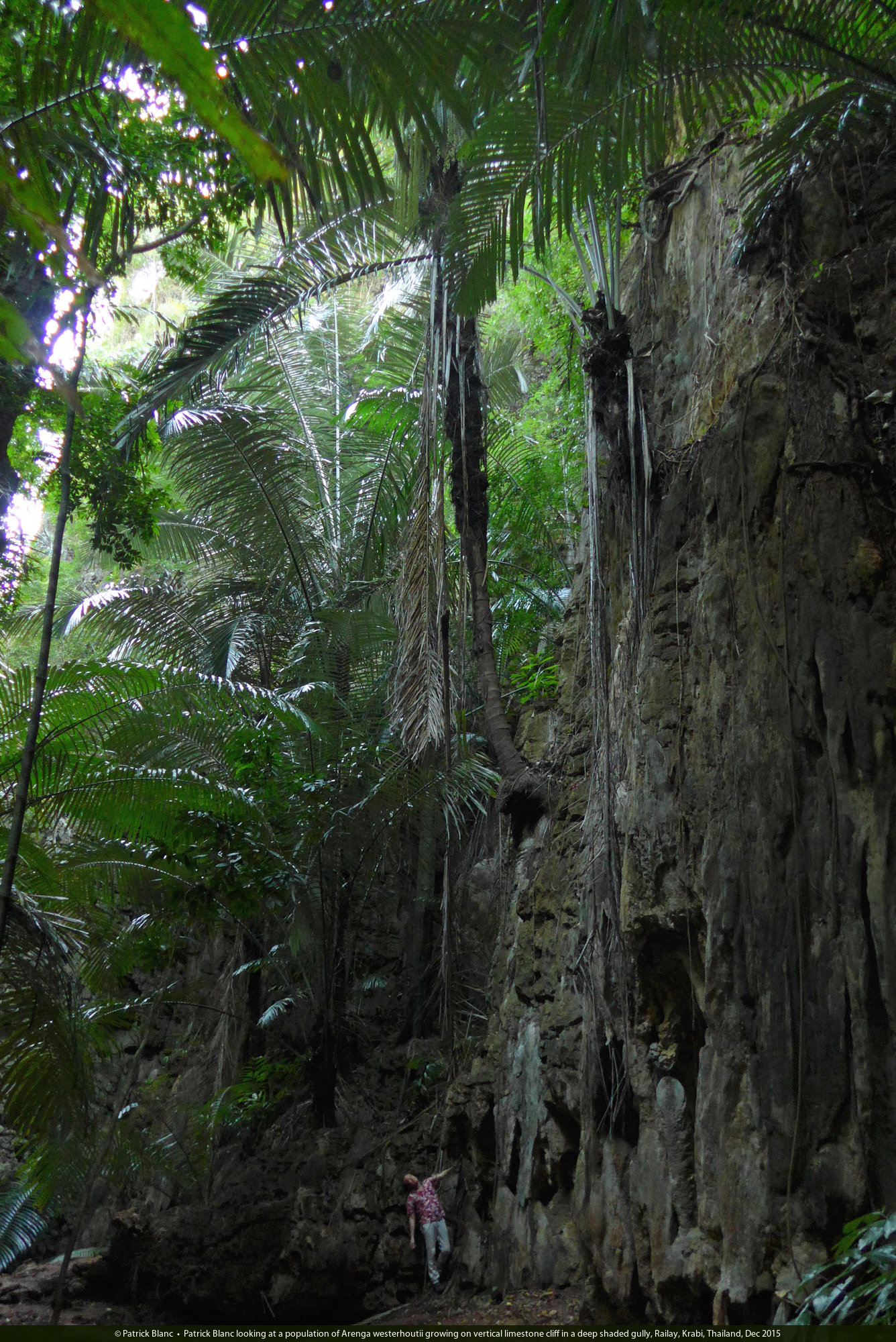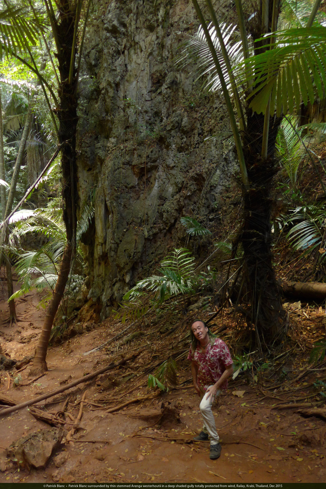 Patrick Blanc surrounded by thin stemmed Arenga westerhoutii in a deep shaded gully totally protected from wind, Railay, Krabi, Thailand, Dec 2015