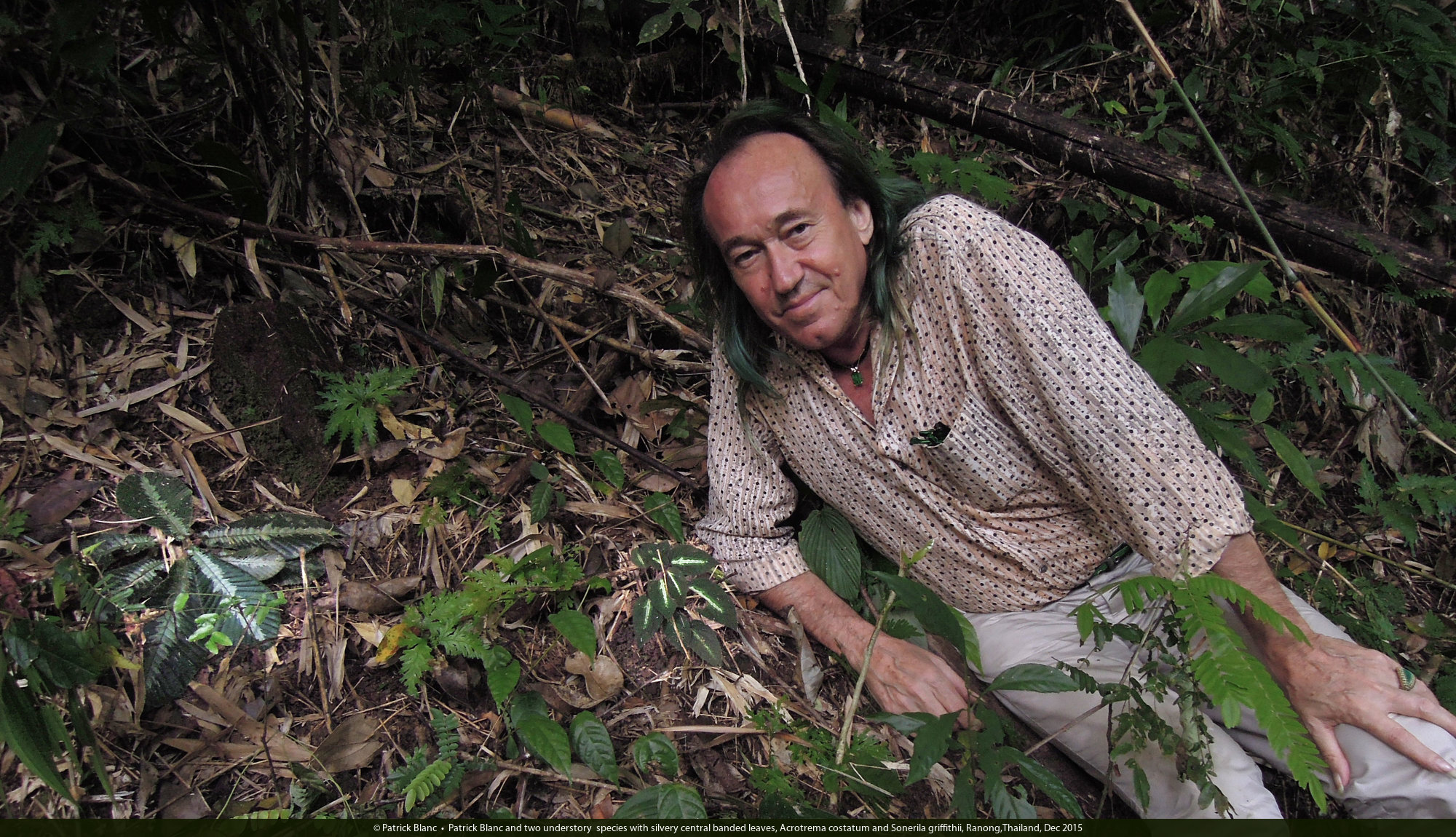 Patrick Blanc and two understory species with silvery central banded leaves, Acrotrema costatum and Sonerila griffithii, Ranong,Thailand, Dec 2015