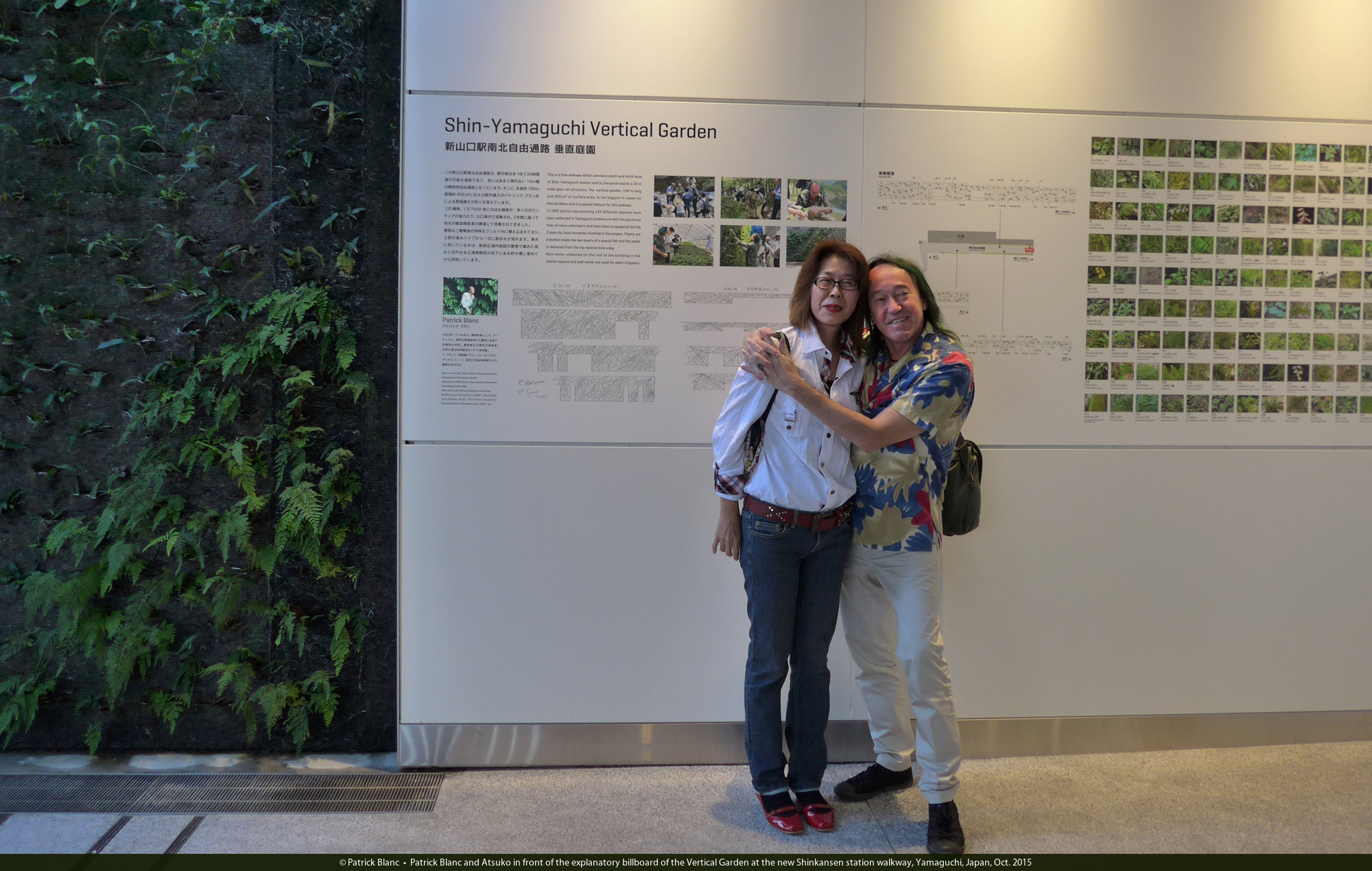 Patrick Blanc and Atsuko in front of the explanatory billboard of the Vertical Garden at the new Shinkansen station walkway, Yamaguchi, Japan, Oct. 2015