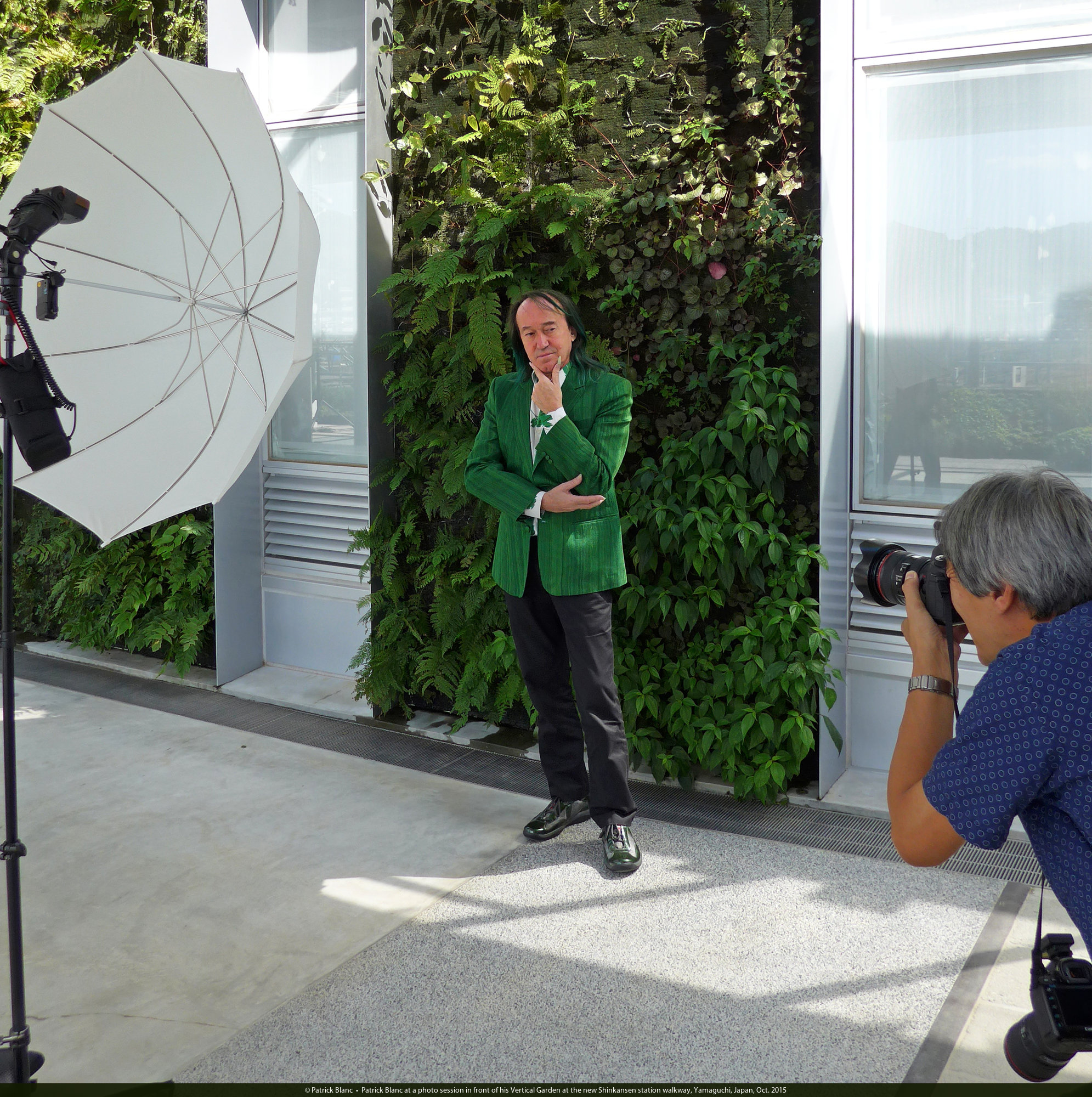 Patrick Blanc at a photo session in front of his Vertical Garden at the new Shinkansen station walkway, Yamaguchi, Japan, Oct. 2015