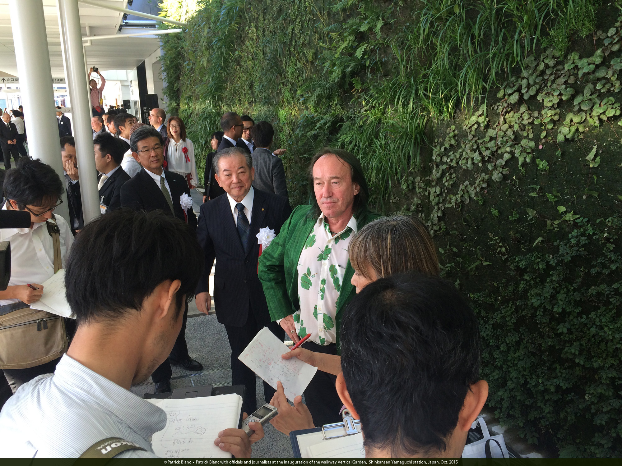 Patrick Blanc with officials and journalists at the inauguration of the walkway Vertical Garden, Shinkansen Yamaguchi station, Japan, Oct. 2015