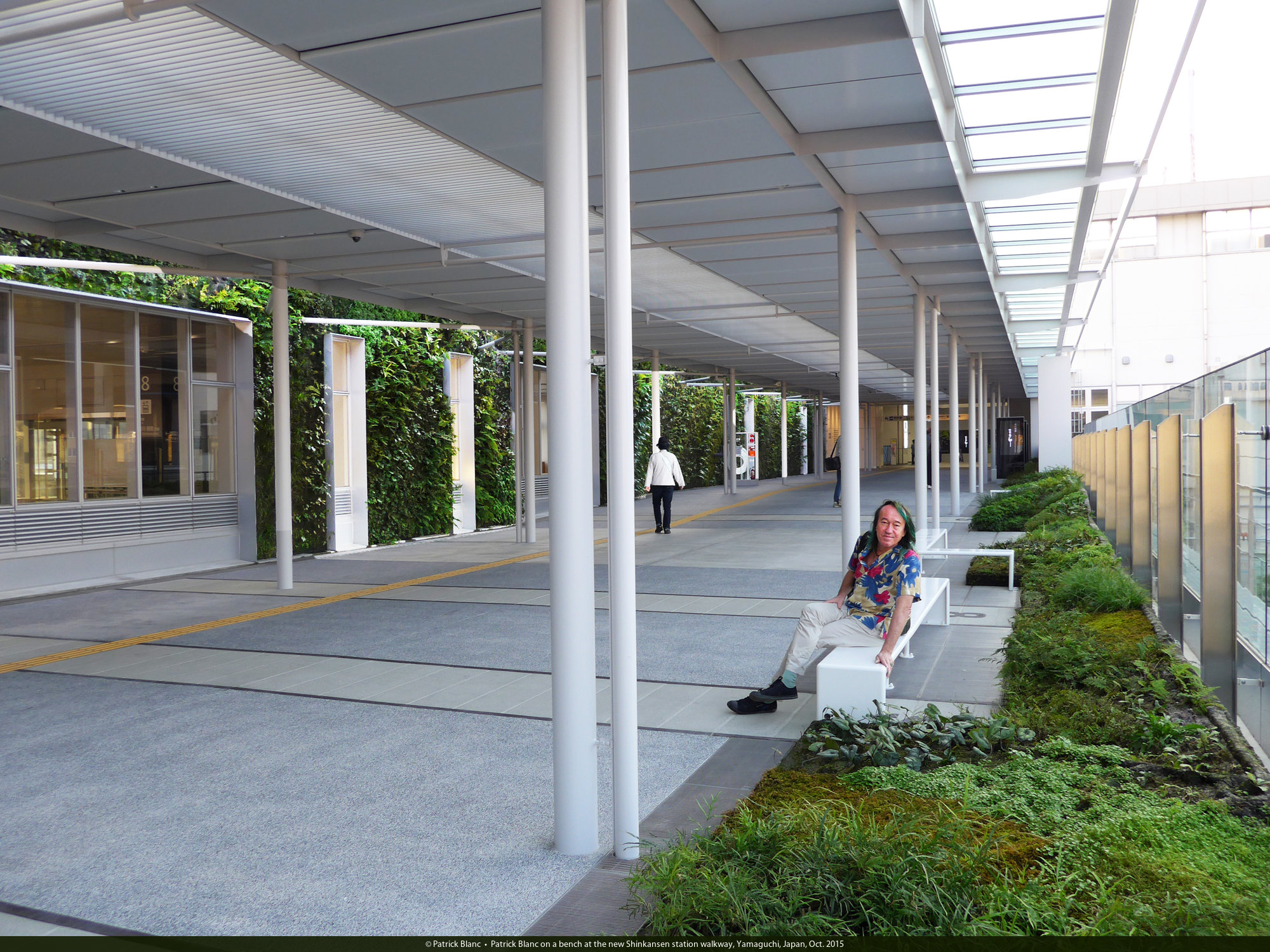 Patrick Blanc on a bench at the new Shinkansen station walkway, Yamaguchi, Japan, Oct. 2015