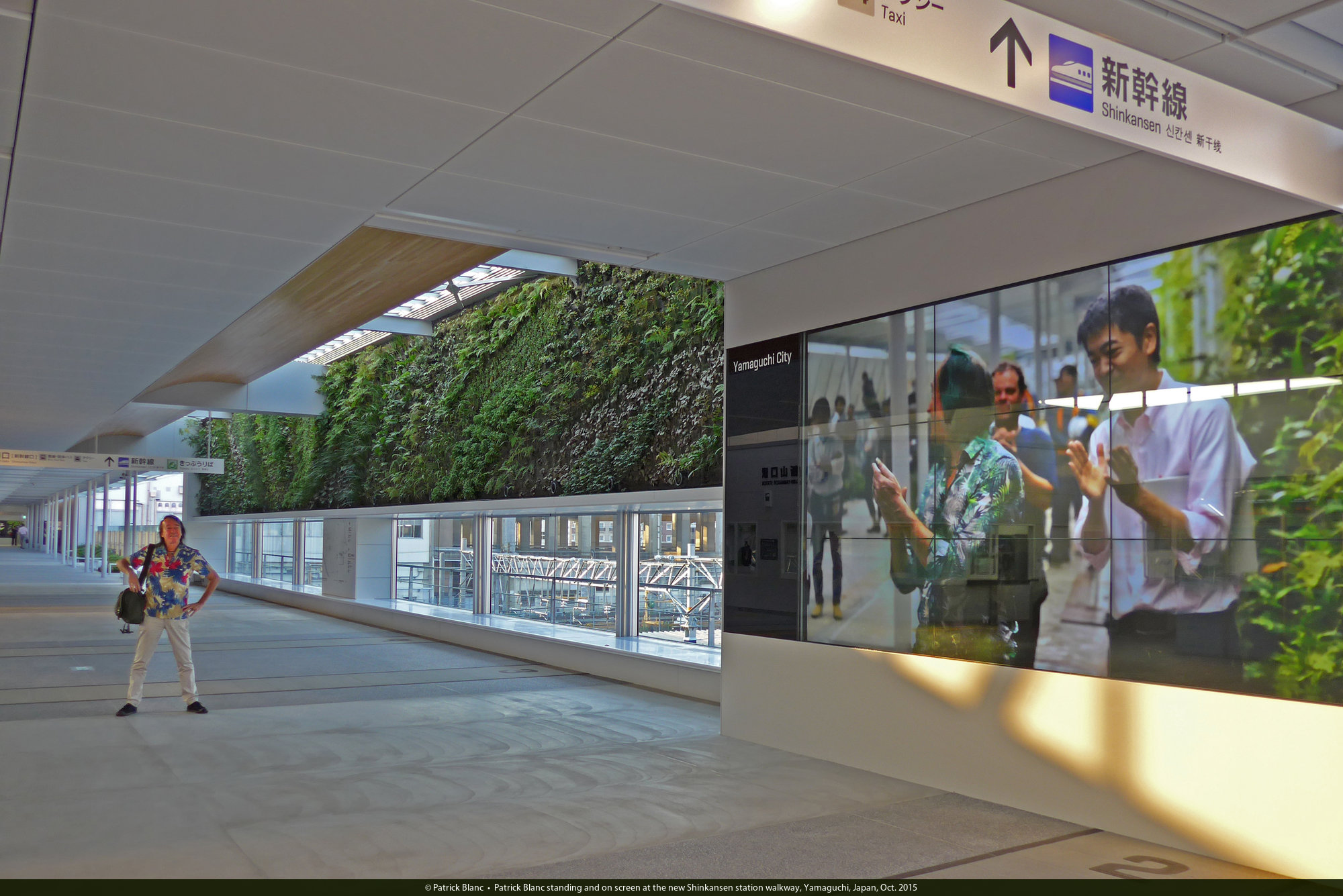 Patrick Blanc standing and on screen at the new Shinkansen station walkway, Yamaguchi, Japan, Oct. 2015