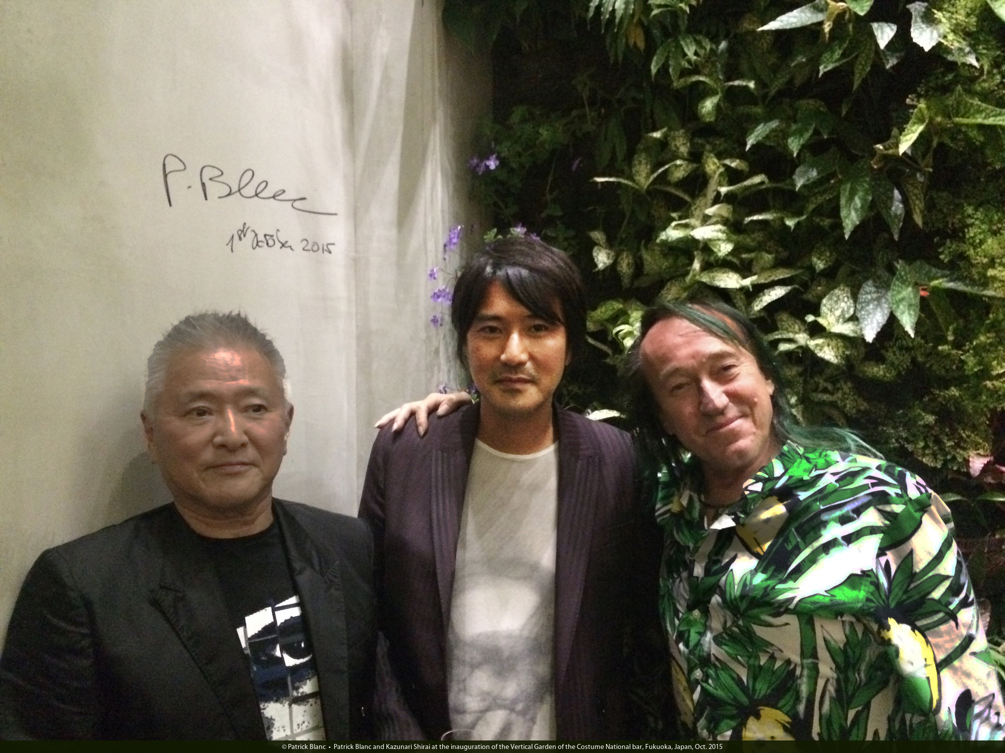 Patrick Blanc and Kazunari Shirai at the inauguration of the Vertical Garden of the Costume National bar, Fukuoka, Japan, Oct. 2015