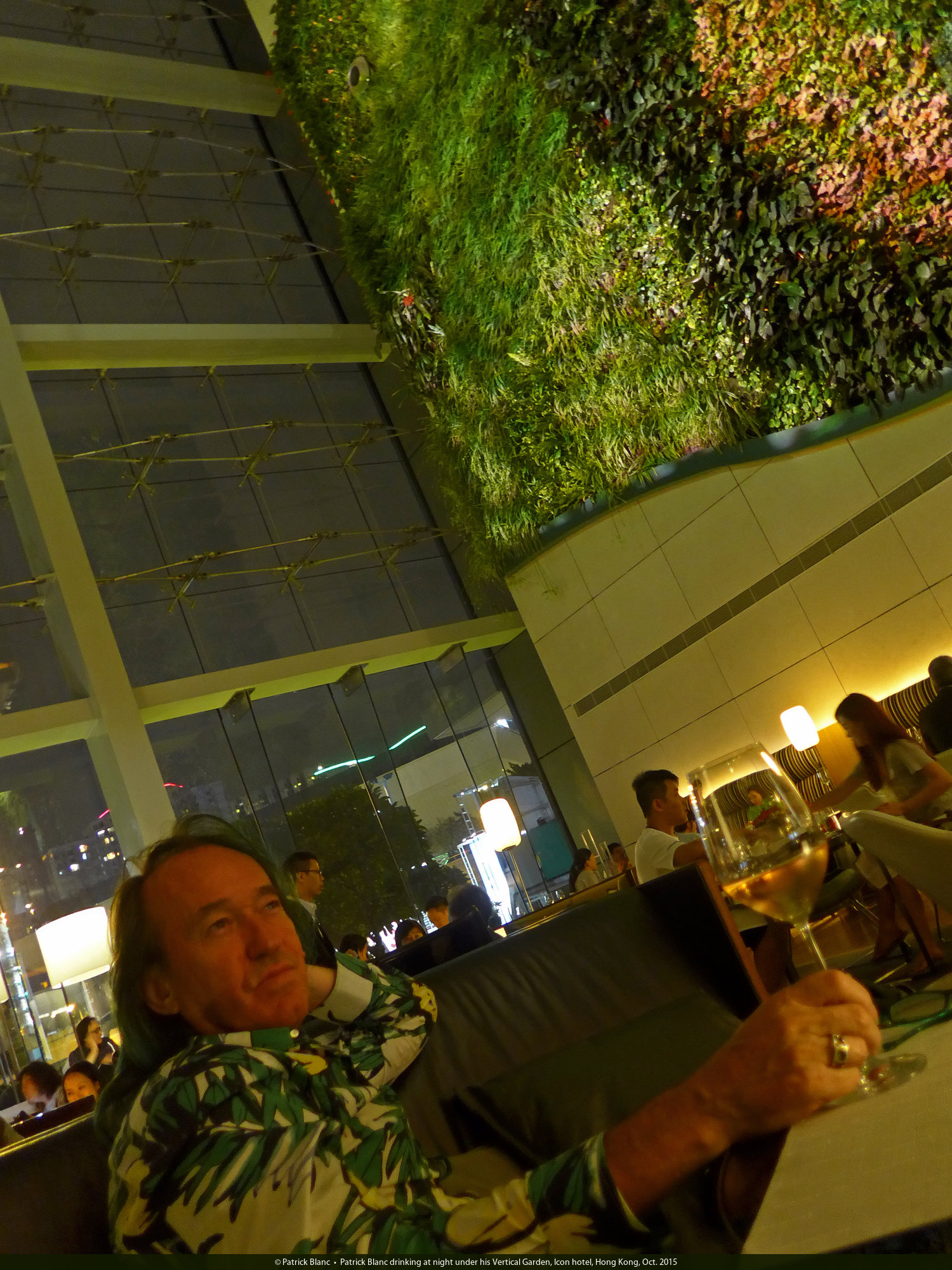 Patrick Blanc drinking at night under his Vertical Garden, Icon hotel, Hong Kong, Oct. 2015
