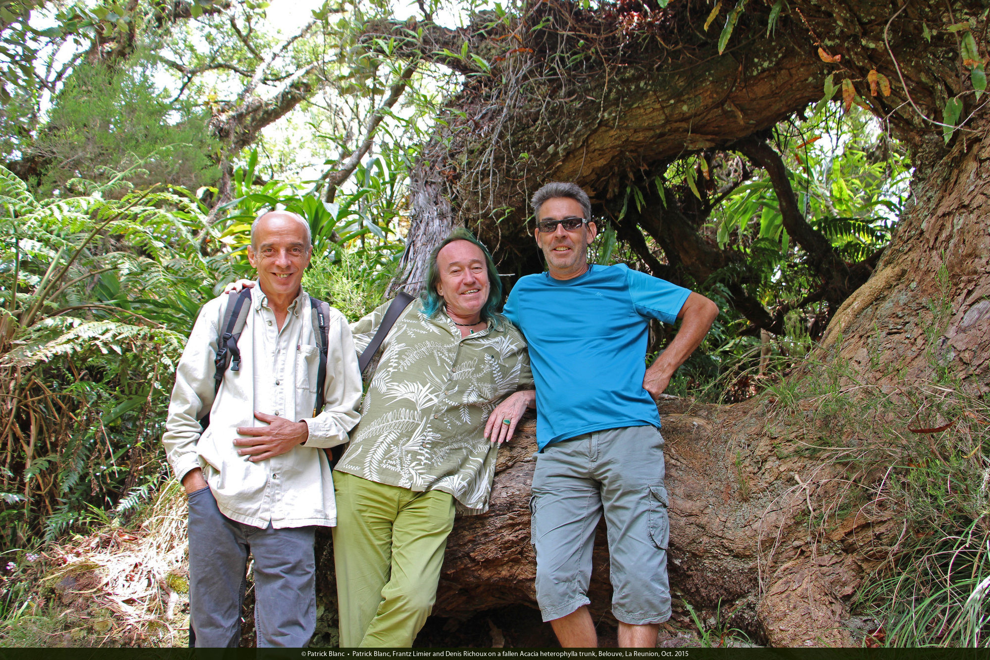 Patrick Blanc, Frantz Limier and Denis Richoux on a fallen Acacia heterophylla trunk, Belouve, La Reunion, Oct. 2015