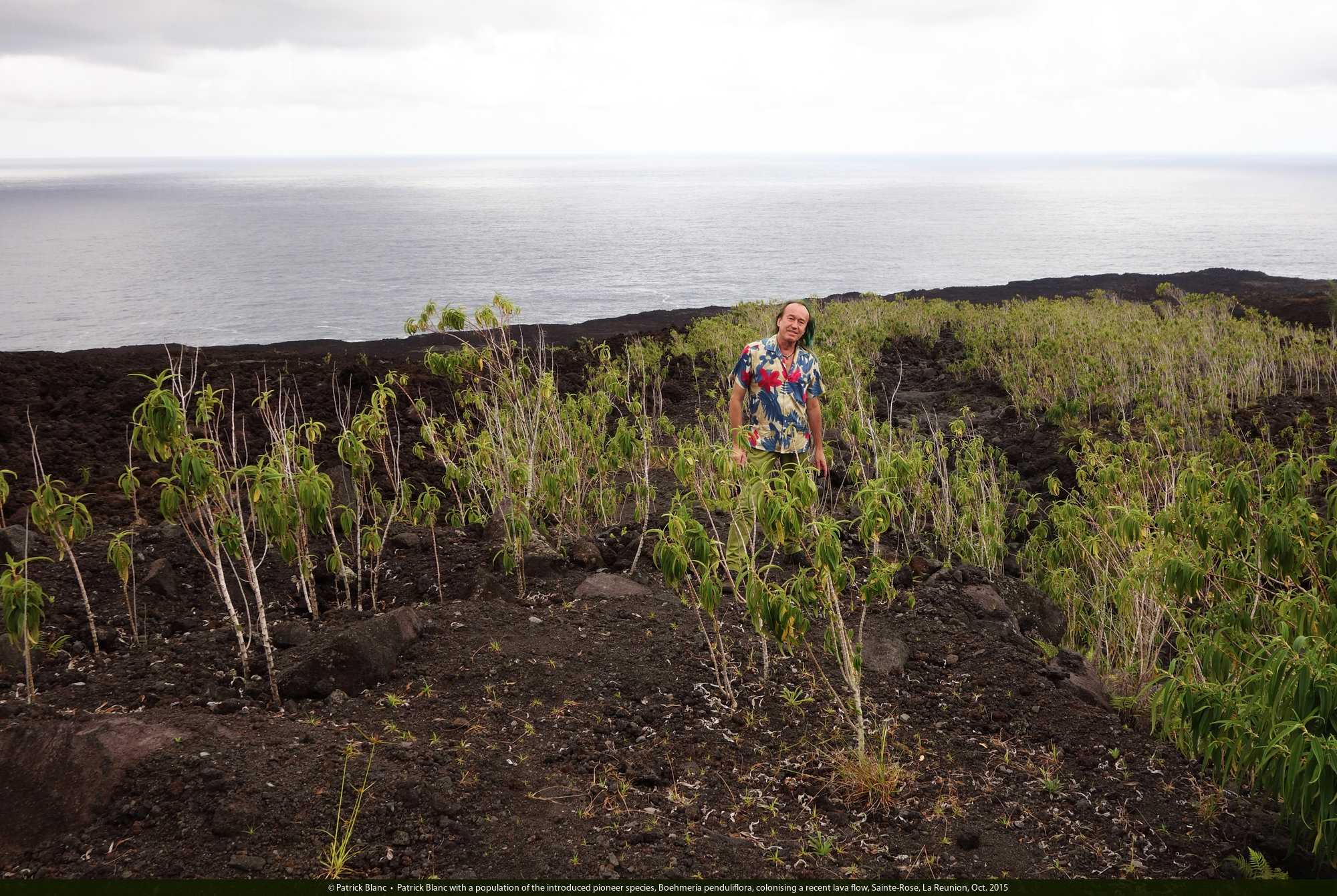 Patrick Blanc with a population of the introduced pioneer species, Boehmeria penduliflora, colonising a recent lava flow, Sainte-Rose, La Reunion, Oct. 2015