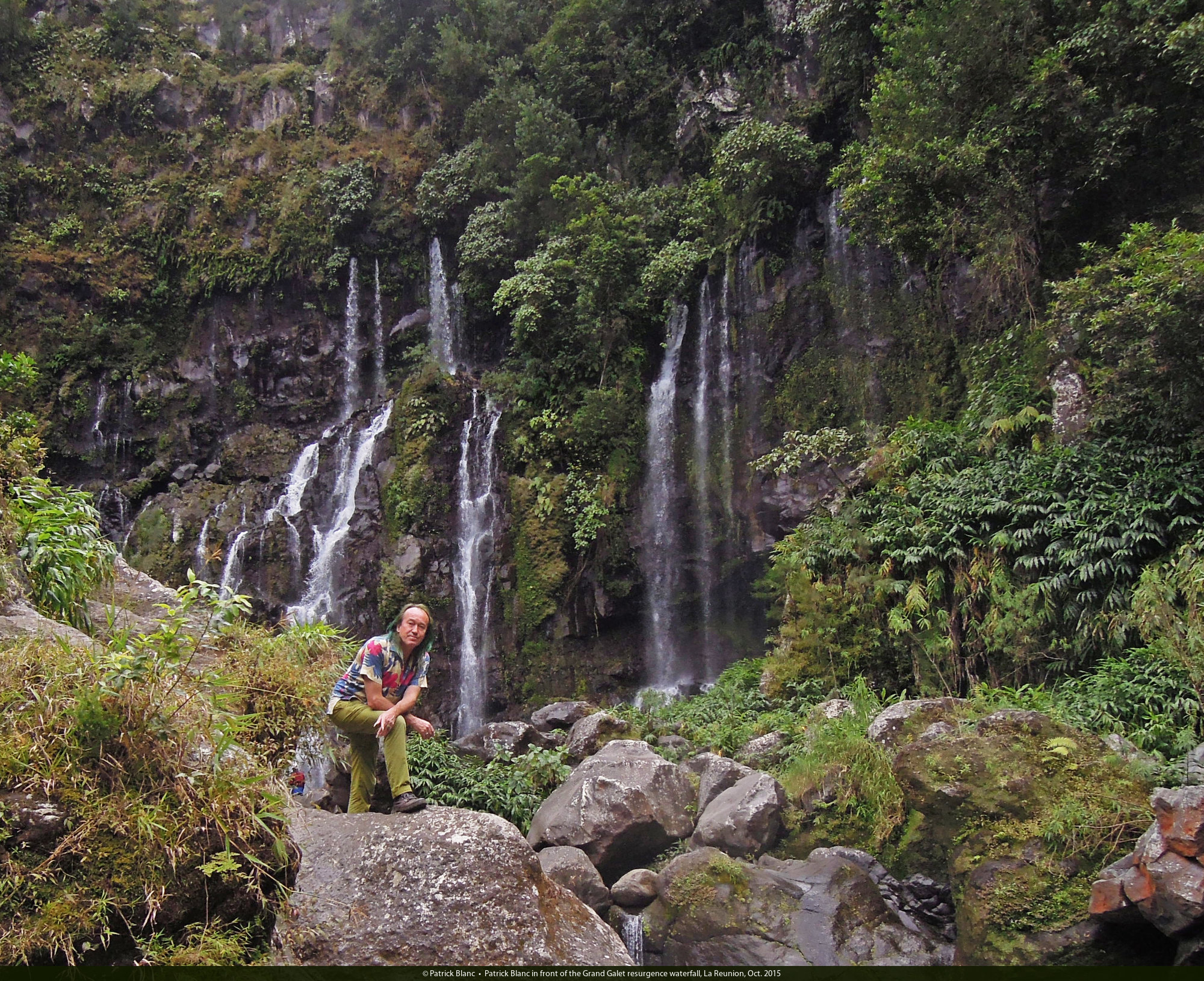 Patrick Blanc in front of the Grand Galet resurgence waterfall, La Reunion, Oct. 2015