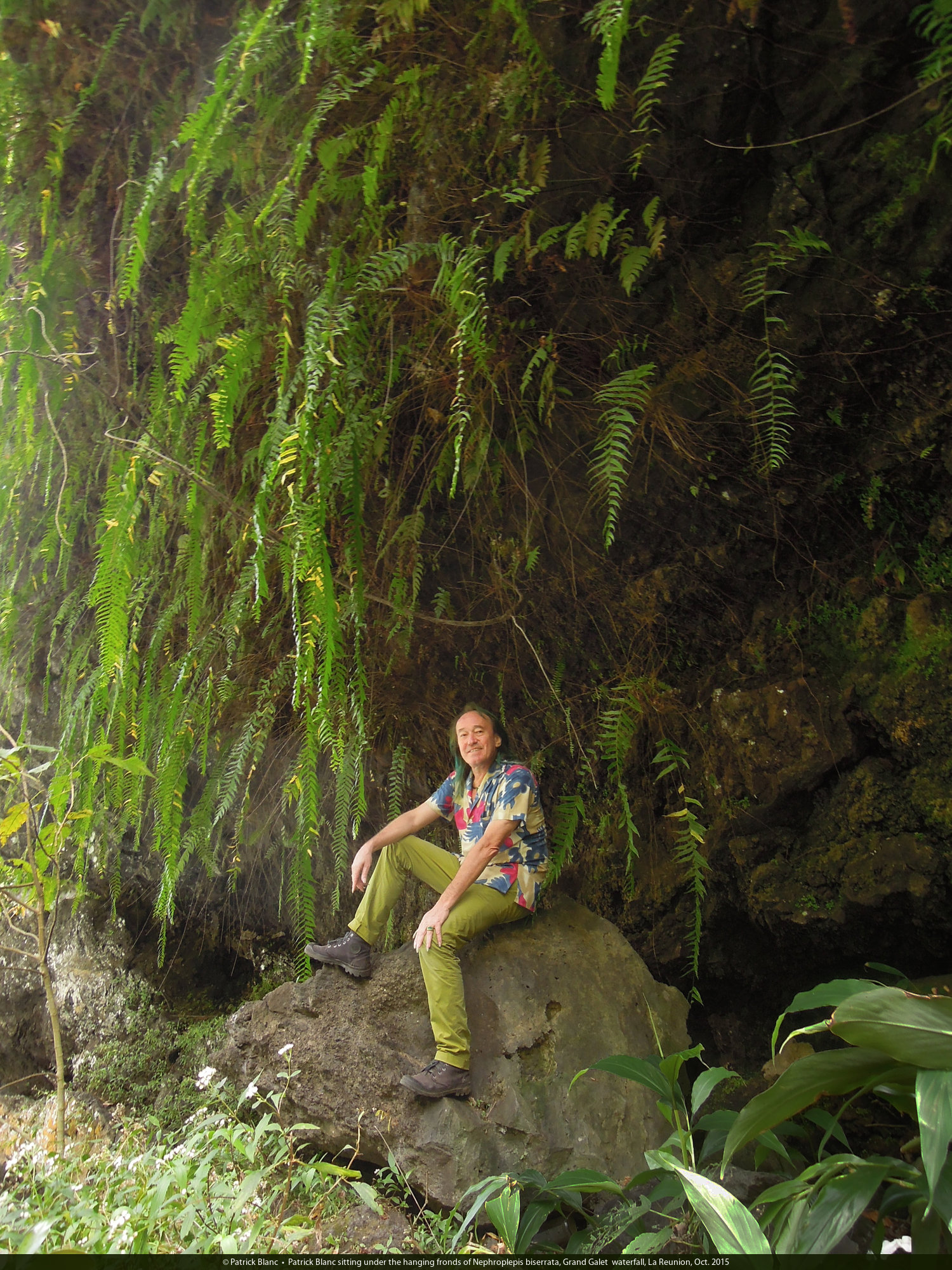 Patrick Blanc sitting under the hanging fronds of Nephroplepis biserrata, Grand Galet waterfall, La Reunion, Oct. 2015