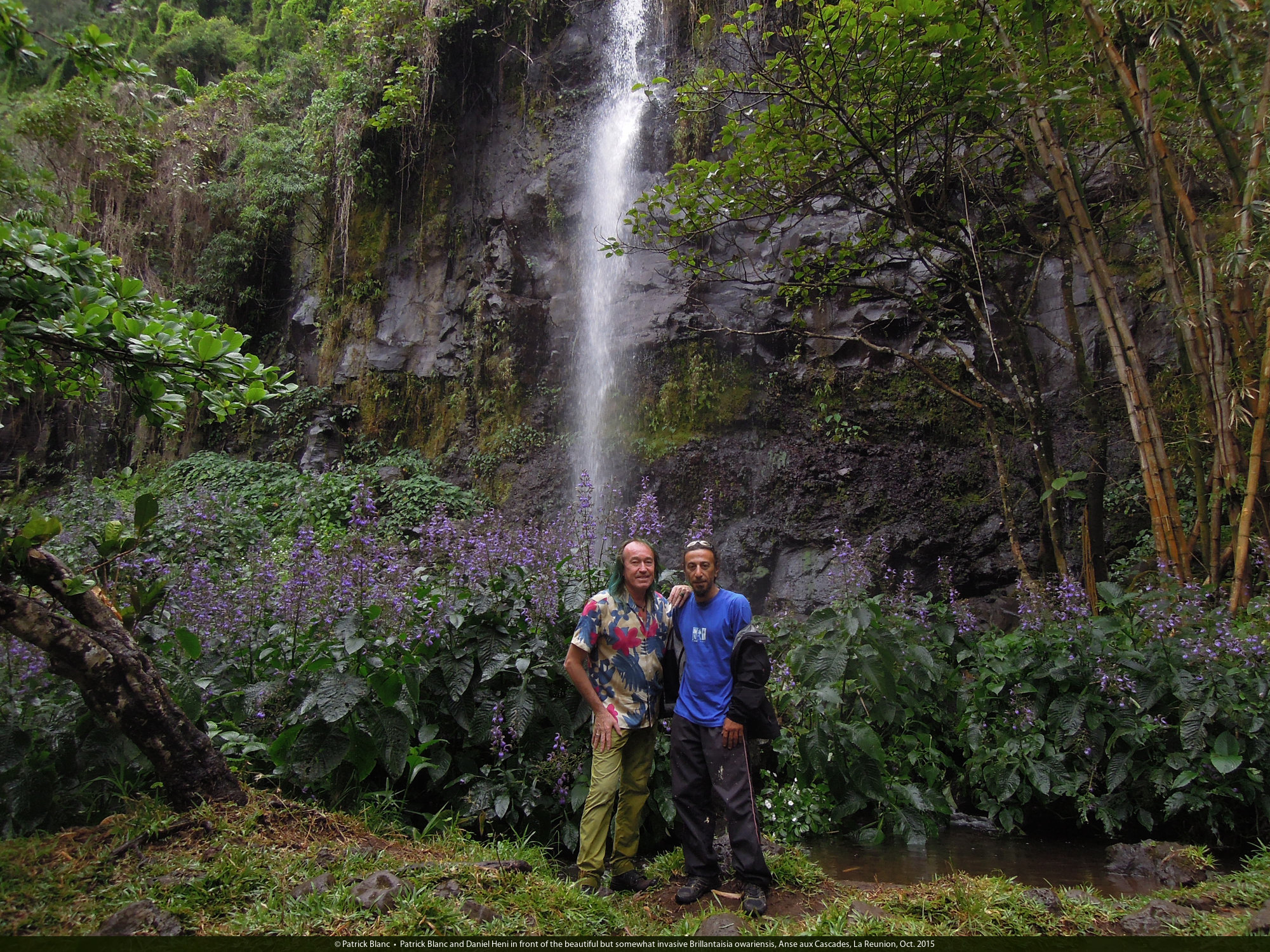 Patrick Blanc and Daniel Heni in front of the beautiful but somewhat invasive Brillantaisia owariensis, Anse aux Cascades, La Reunion, Oct. 2015