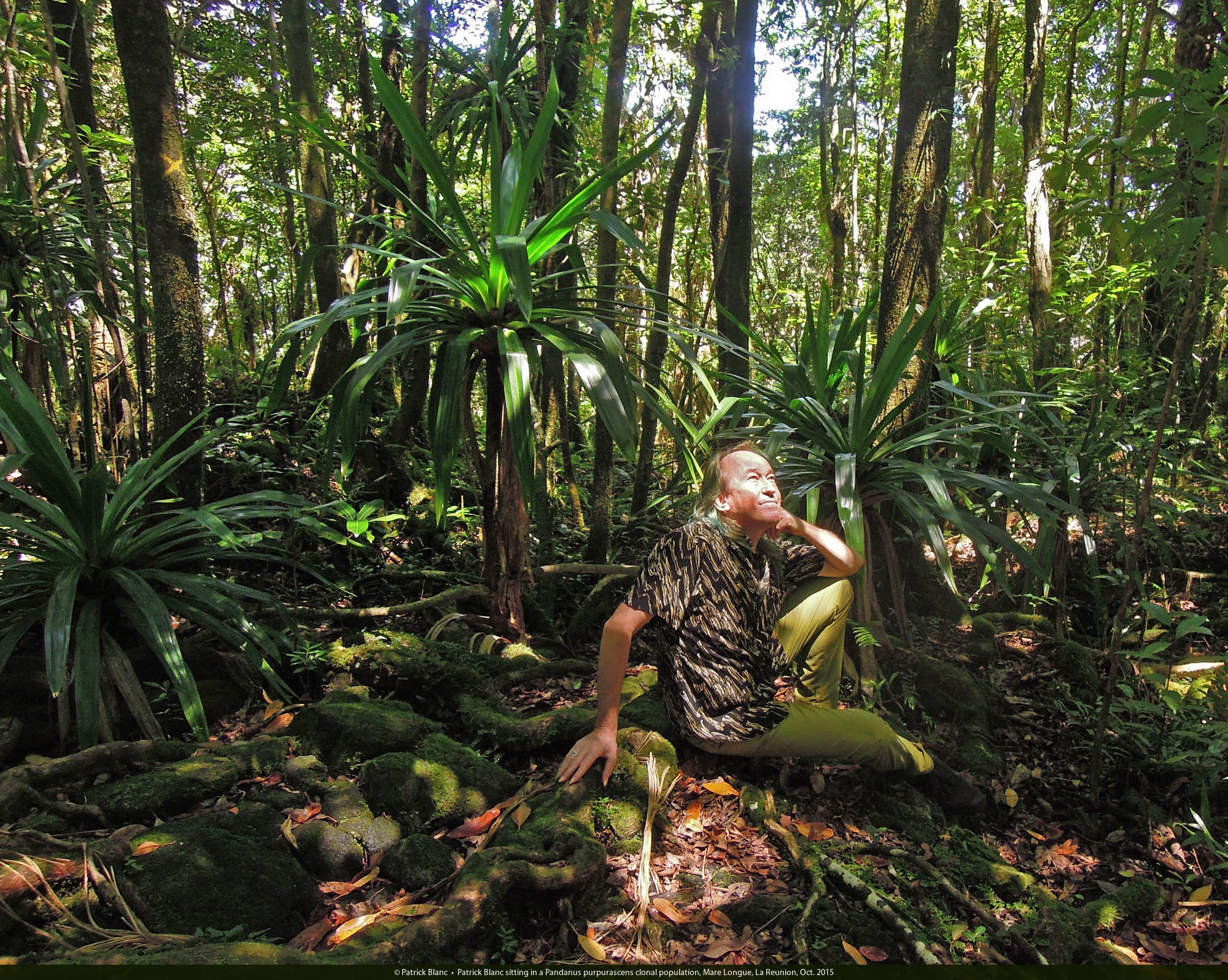Patrick Blanc sitting in a Pandanus purpurascens clonal population, Mare Longue, La Reunion, Oct. 2015