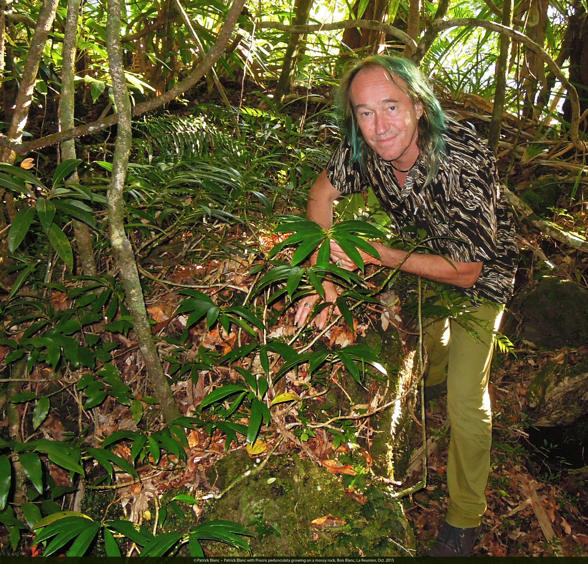 Patrick Blanc with Boehmeria stipularis, under the epiphytic Cordyline mauritiana, Bebour, La Reunion, Oct. 2015