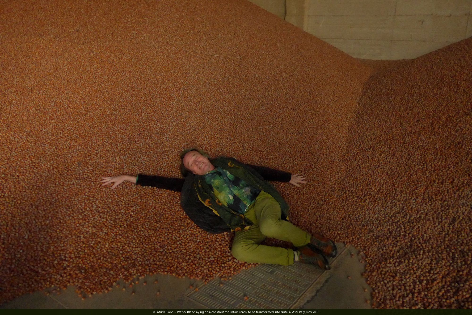Patrick Blanc laying on a chestnut mountain ready to be transformed into Nutella, Asti, Italy, Nov 2015