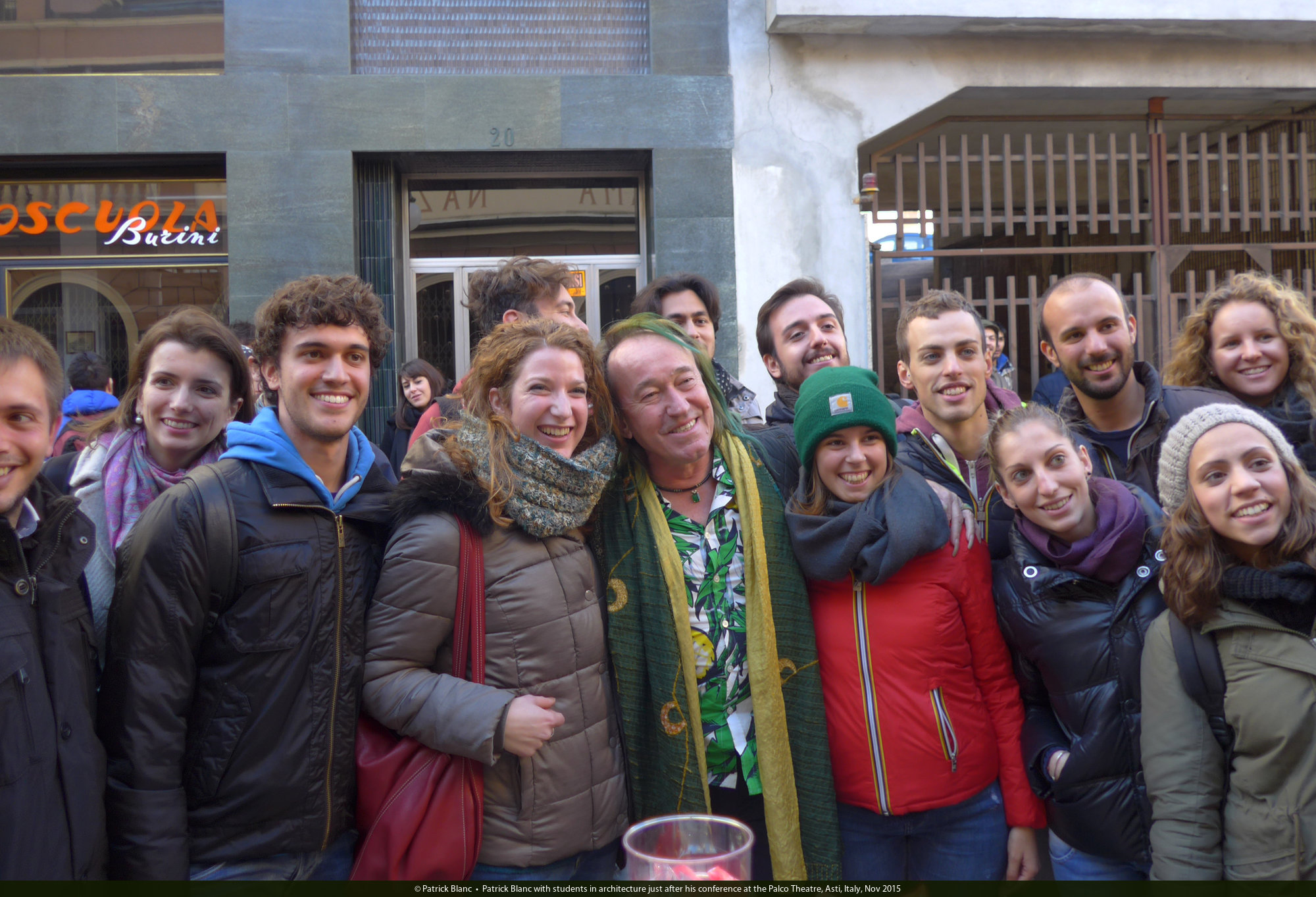 Patrick Blanc with students in architecture just after his conference at the Palco Theatre, Asti, Italy, Nov 2015