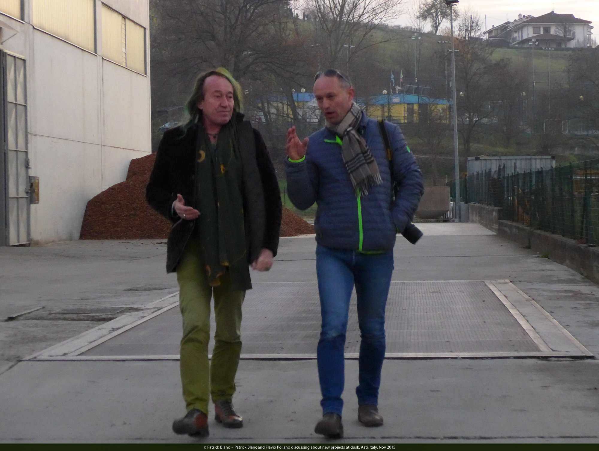 Patrick Blanc and Flavio Pollano discussing about new projects at dusk, Asti, Italy, Nov 2015