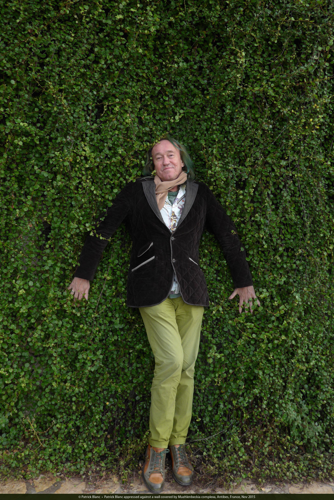 Patrick Blanc appressed against a wall covered by Muehlenbeckia complexa, Antibes, France, Nov 2015