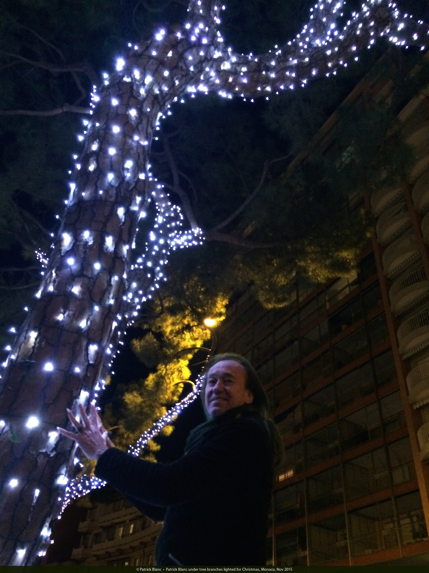 Patrick Blanc under tree branches lighted for Christmas, Monaco, Nov 2015