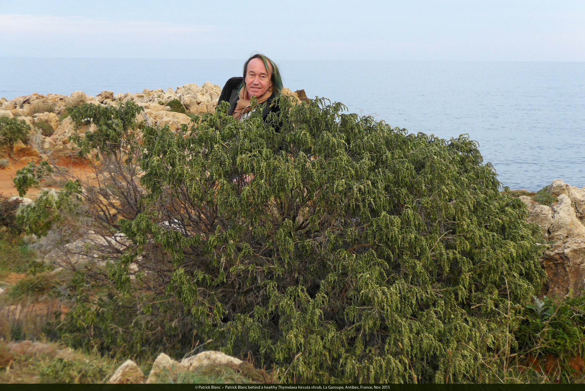 Patrick Blanc behind a healthy Thymelaea hirsuta shrub, La Garoupe, Antibes, France, Nov 2015