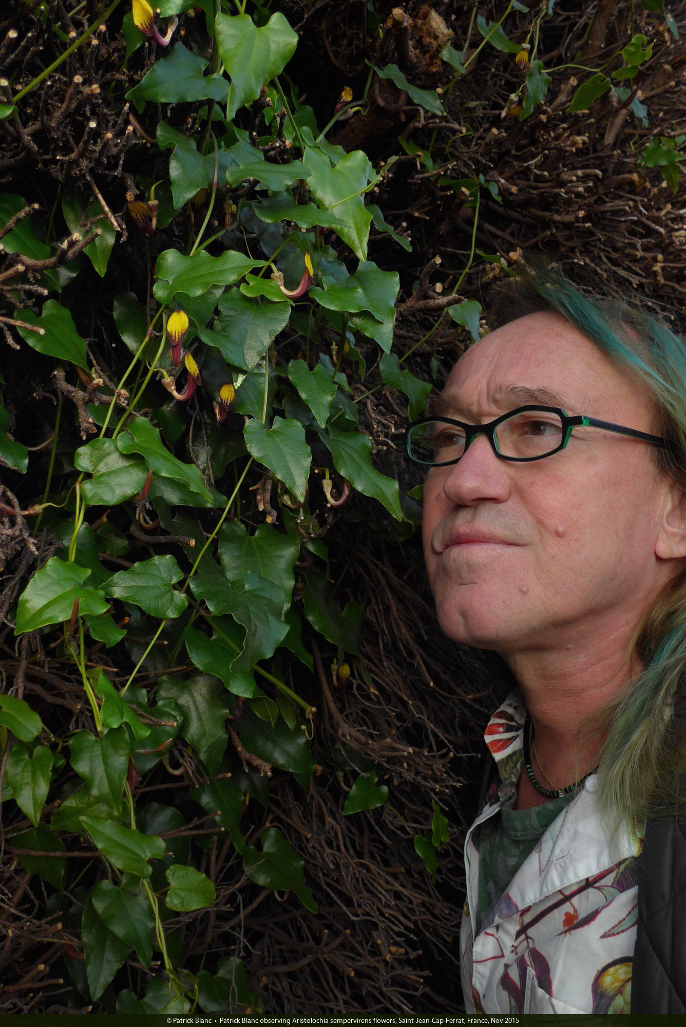 Patrick Blanc observing Aristolochia sempervirens flowers, Saint-Jean-Cap-Ferrat, France, Nov 2015