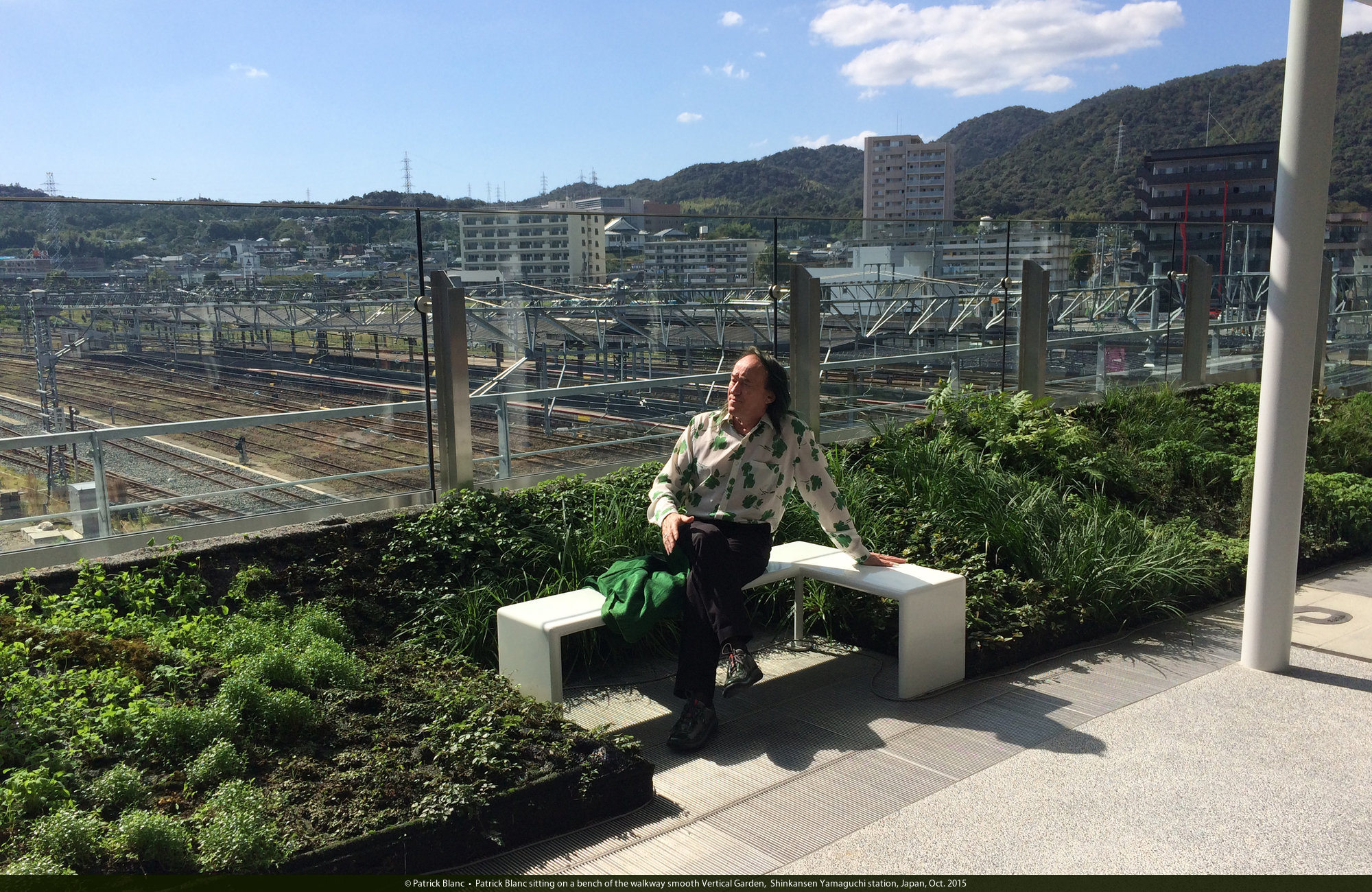 Patrick Blanc sitting on a bench of the walkway smooth Vertical Garden, Shinkansen Yamaguchi station, Japan, Oct. 2015