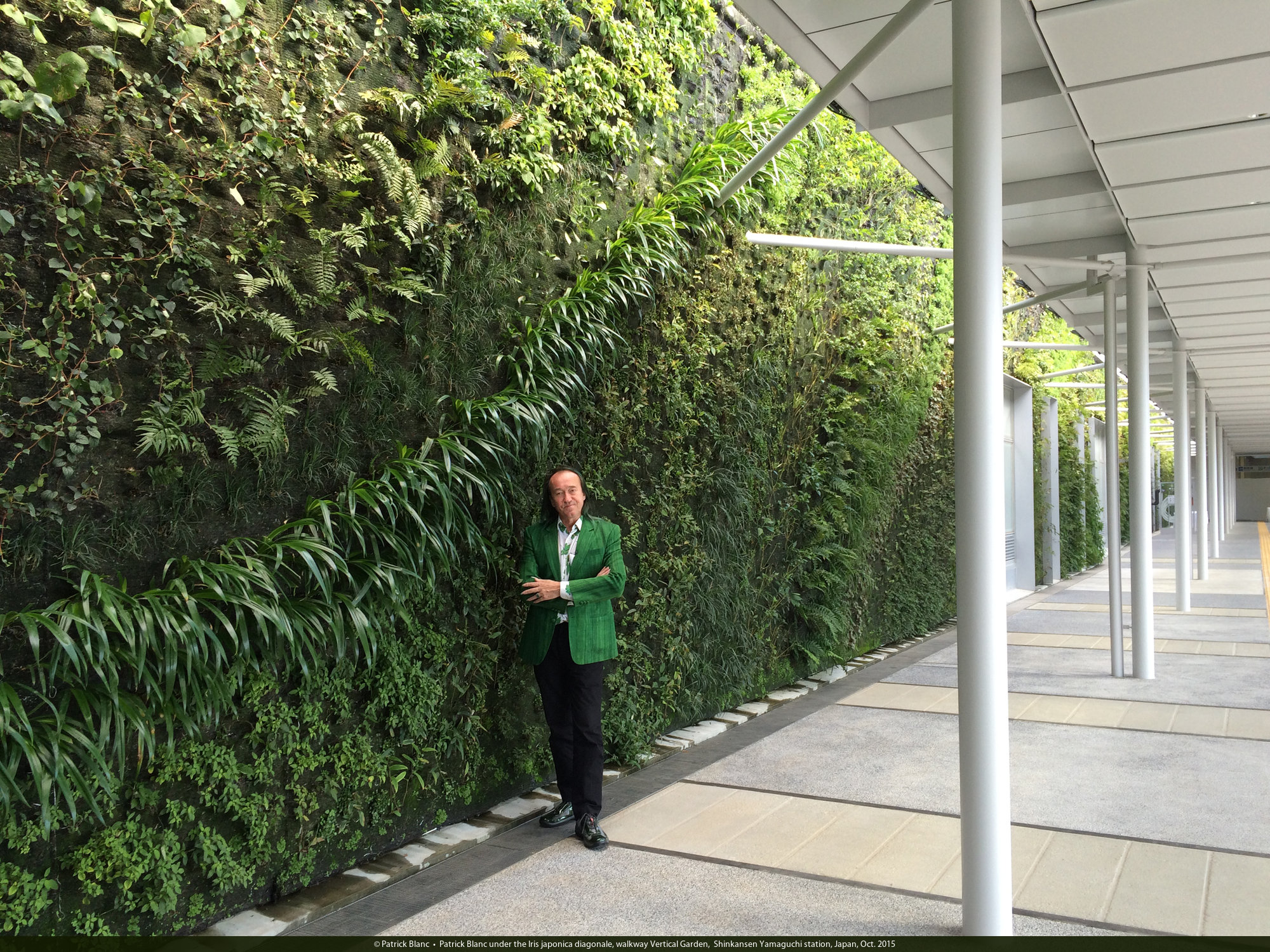 Patrick Blanc under the Iris japonica diagonale, walkway Vertical Garden, Shinkansen Yamaguchi station, Japan, Oct. 2015