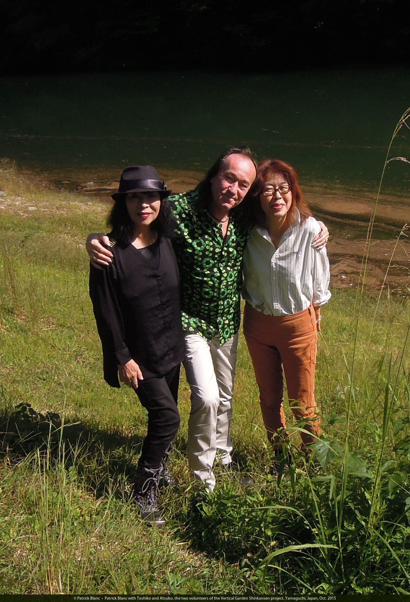 Patrick Blanc with Toshiko and Atsuko, the two volunteers of the Vertical Garden Shinkansen project, Yamaguchi, Japan, Oct. 2015