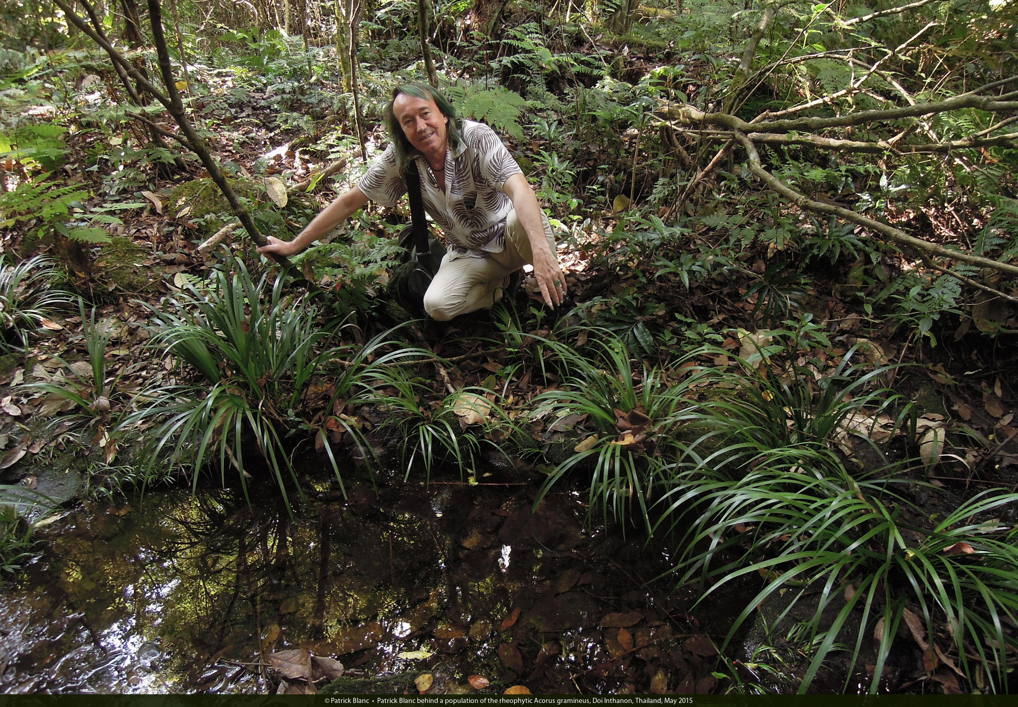 Patrick Blanc behind a population of the rheophytic Acorus gramineus, Doi Inthanon, Thailand, May 2015