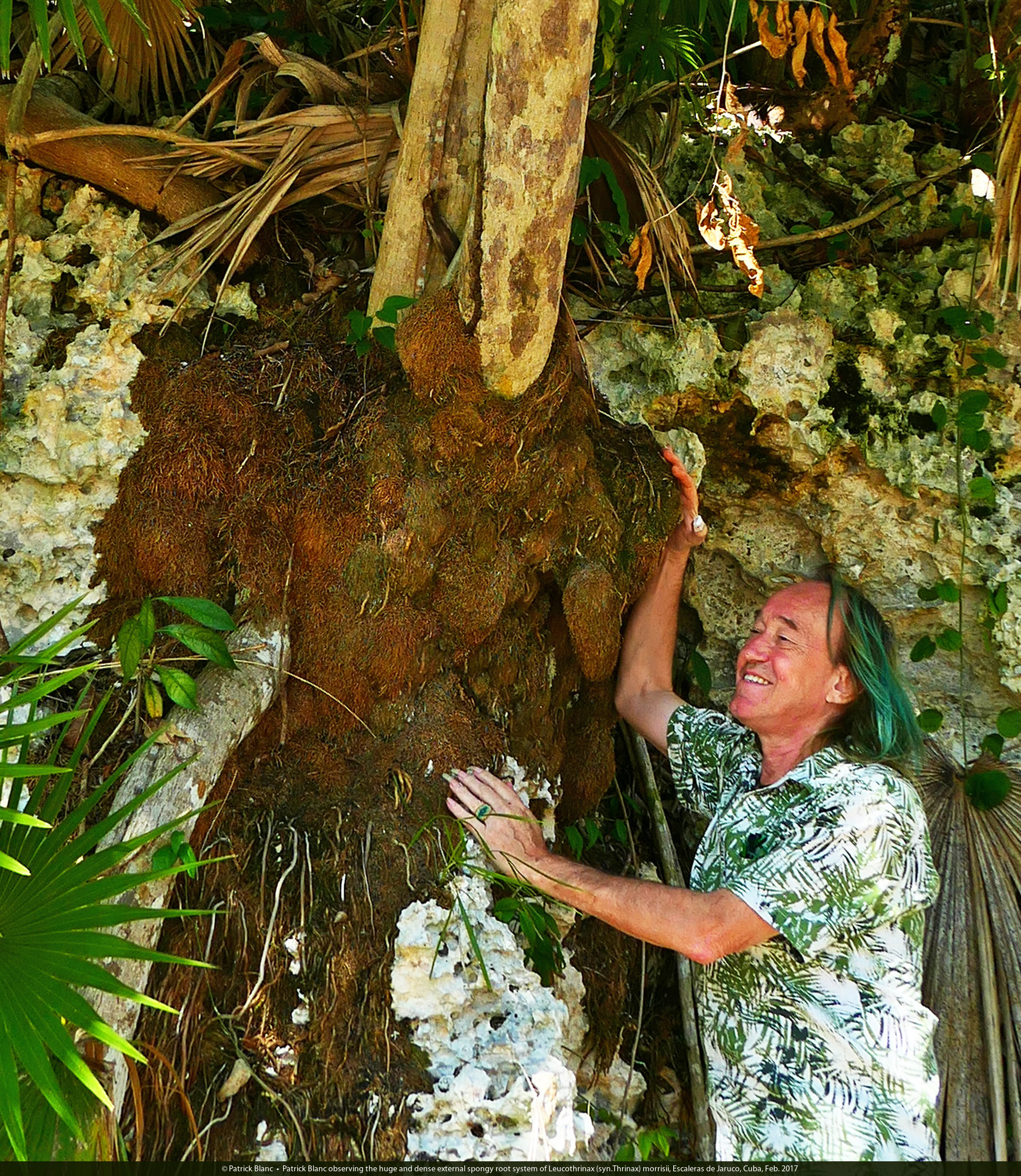 Patrick Blanc observing the huge and dense external spongy root system of Leucothrinax (syn.Thrinax) morrisii, Escaleras de Jaruco, Cuba, Feb. 2017