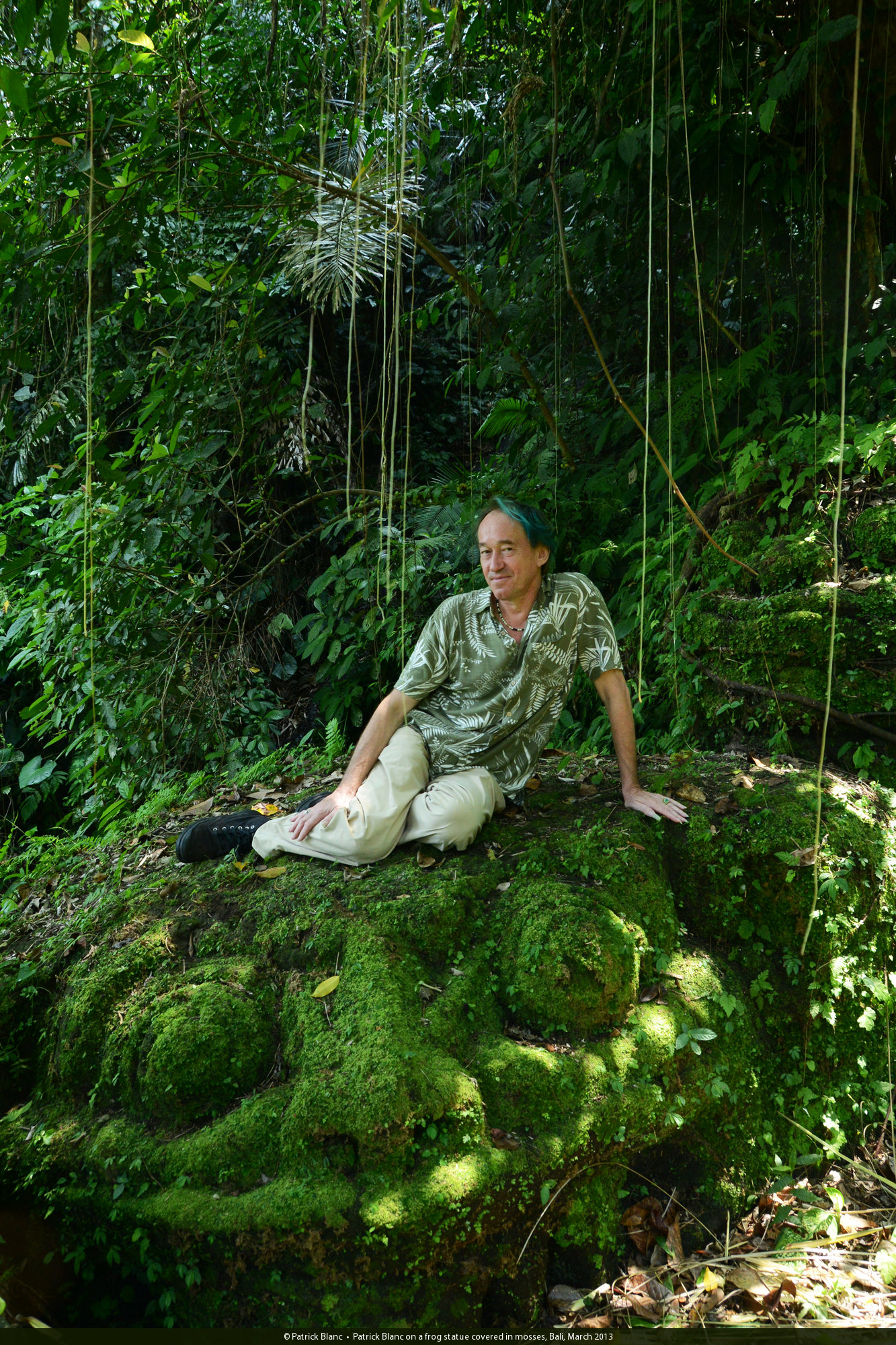 Patrick Blanc on a frog statue covered in mosses, Bali, March 2013
