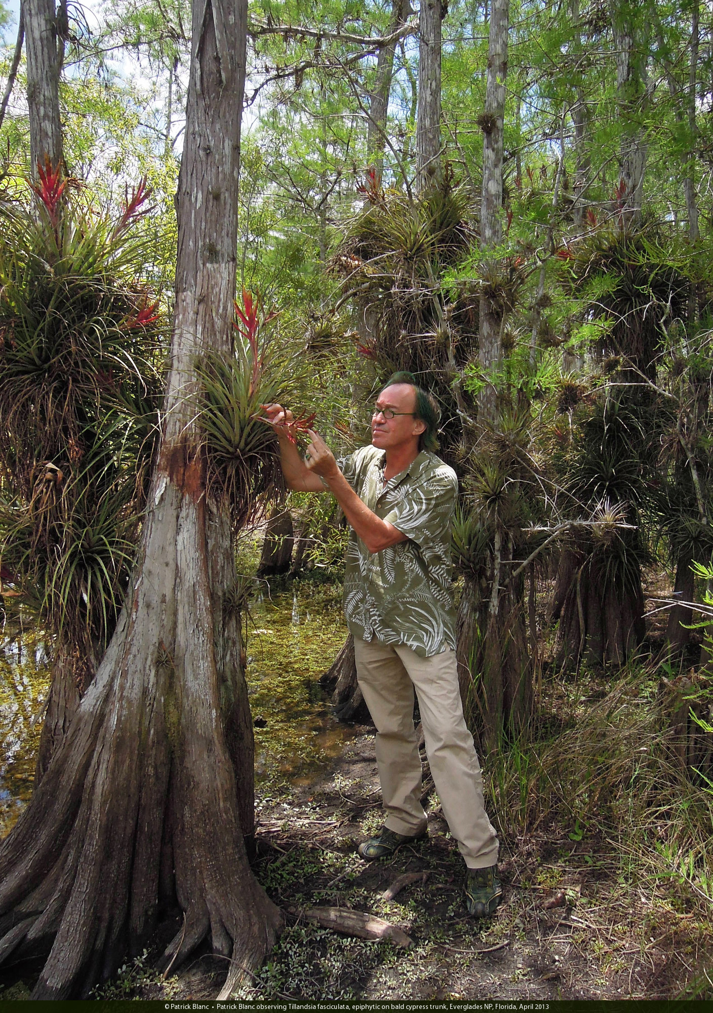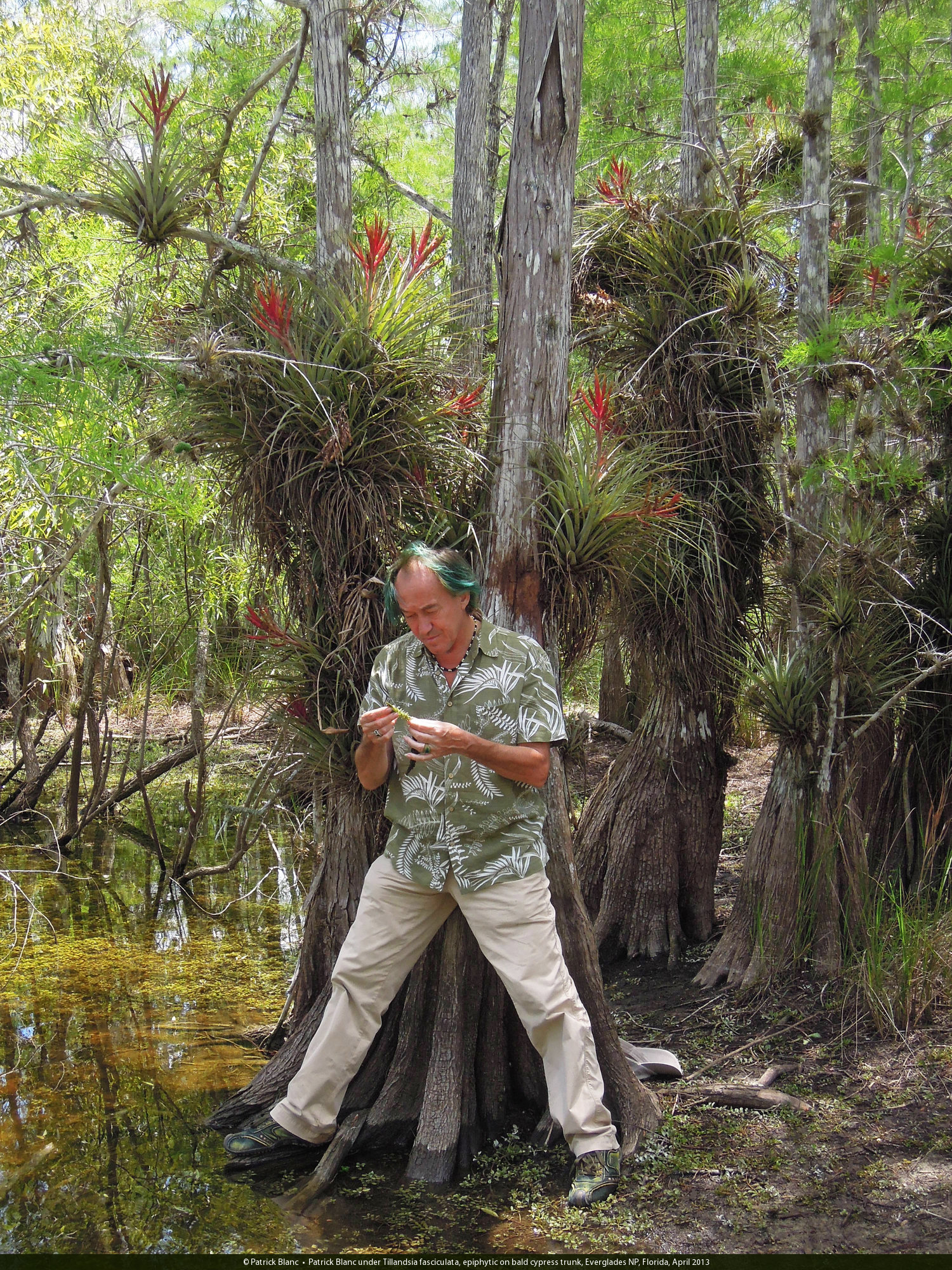 Patrick Blanc under Tillandsia fasciculata, epiphytic on bald cypress trunk, Everglades NP, Florida, April 2013