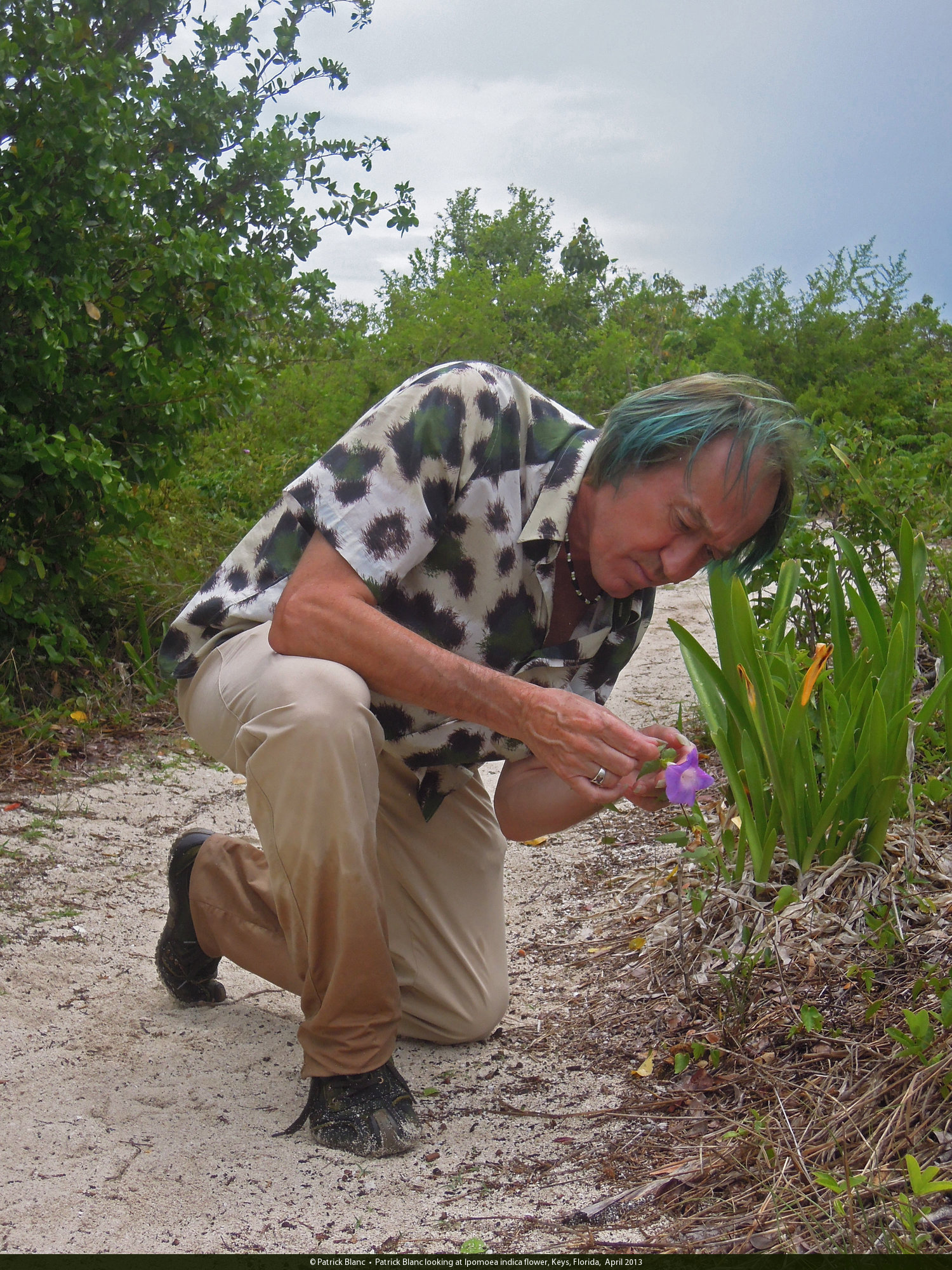 Patrick Blanc looking at Ipomoea indica flower, Keys, Florida, April 2013