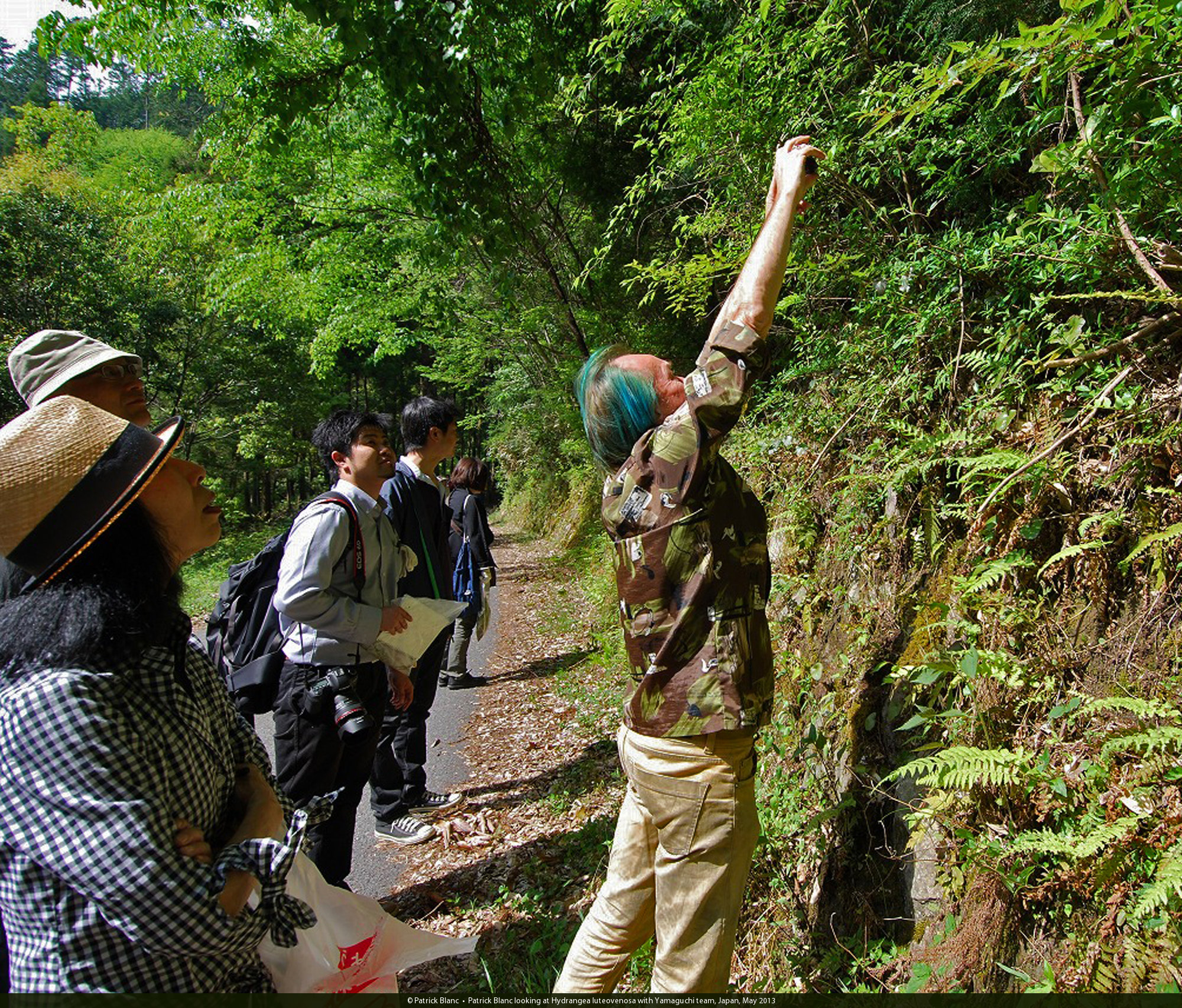 Patrick Blanc looking at Hydrangea luteovenosa with Yamaguchi team, Japan, May 2013