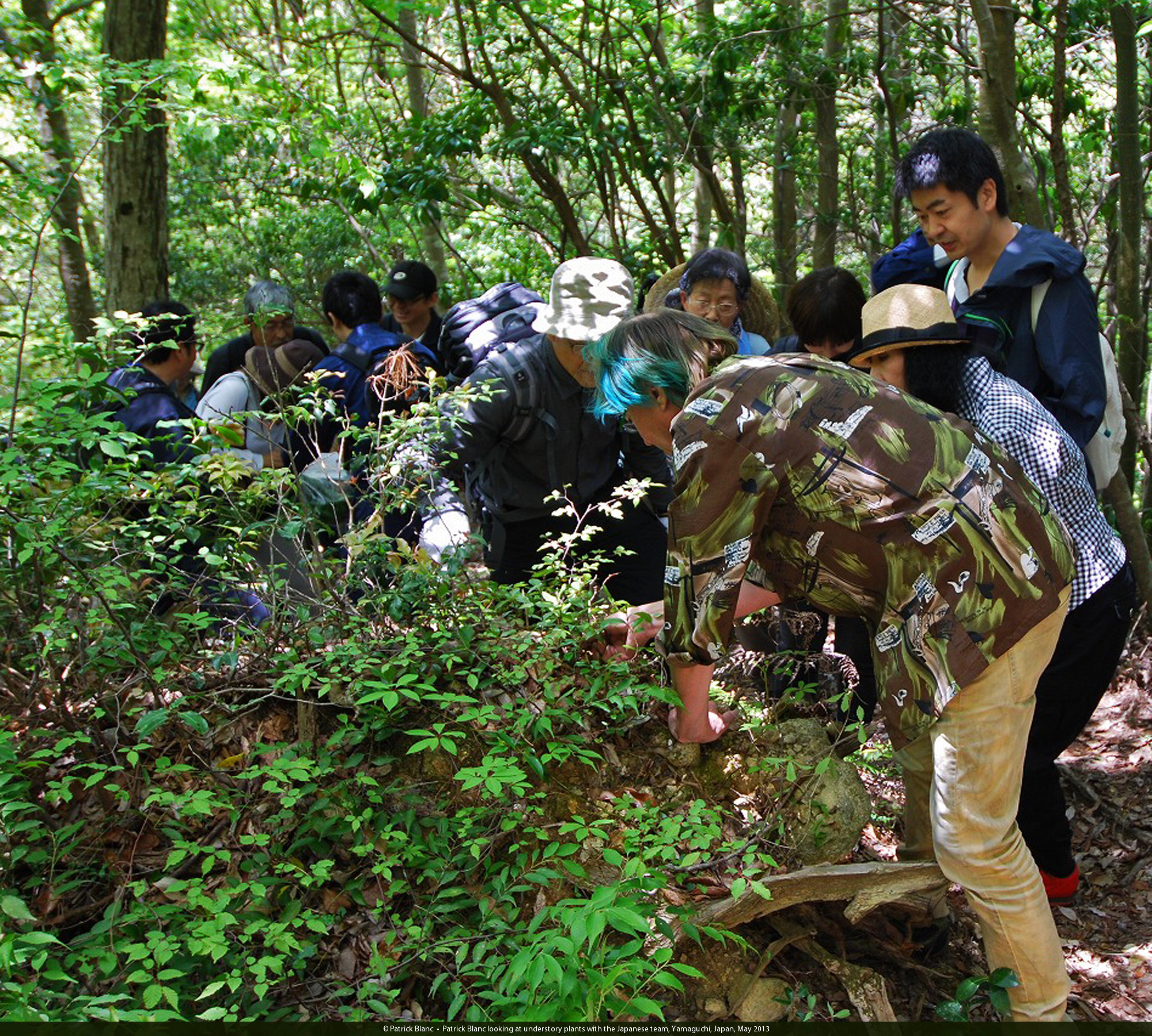 Patrick Blanc looking at understory plants with the Japanese team, Yamaguchi, Japan, May 2013