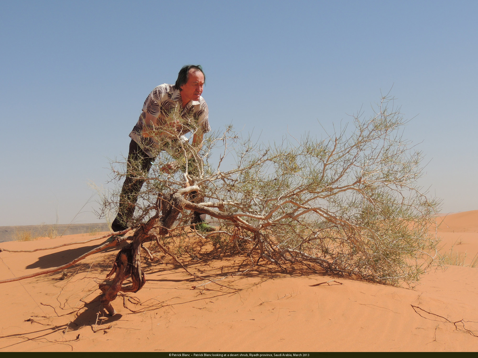 Patrick Blanc looking at a desert shrub, Riyadh province, Saudi Arabia, March 2013