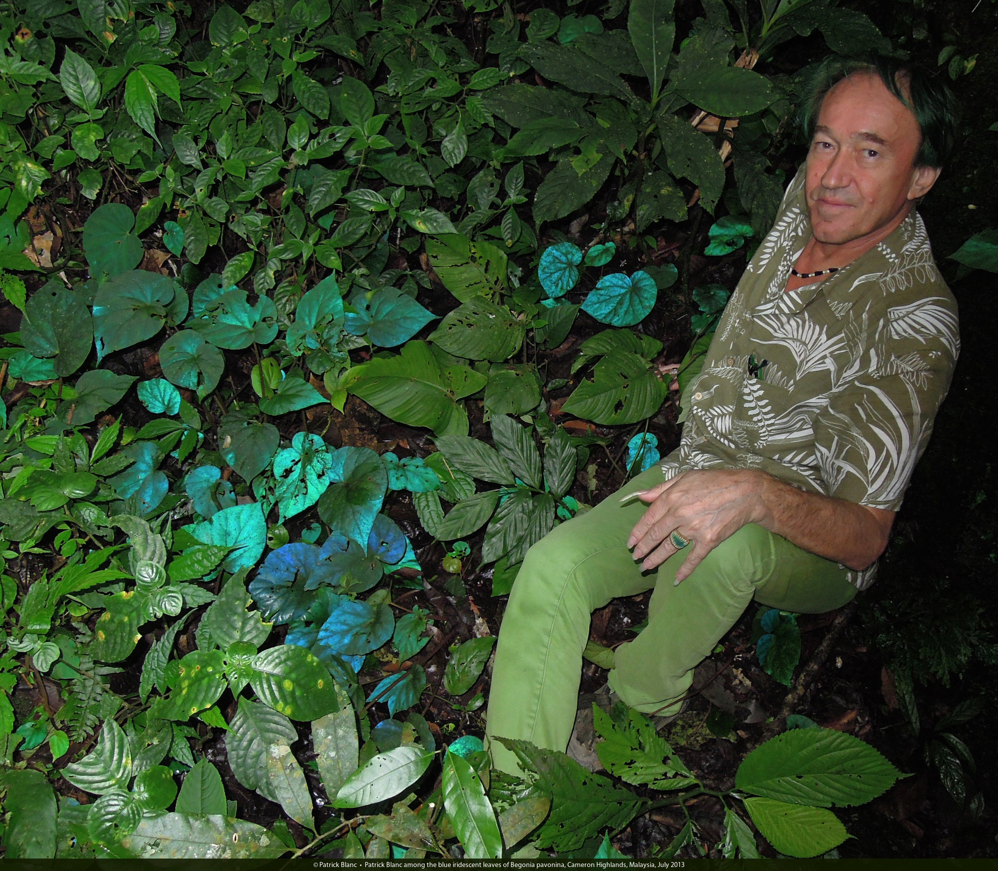 Patrick Blanc among the blue iridescent leaves of Begonia pavonina, Cameron Highlands, Malaysia, July 2013