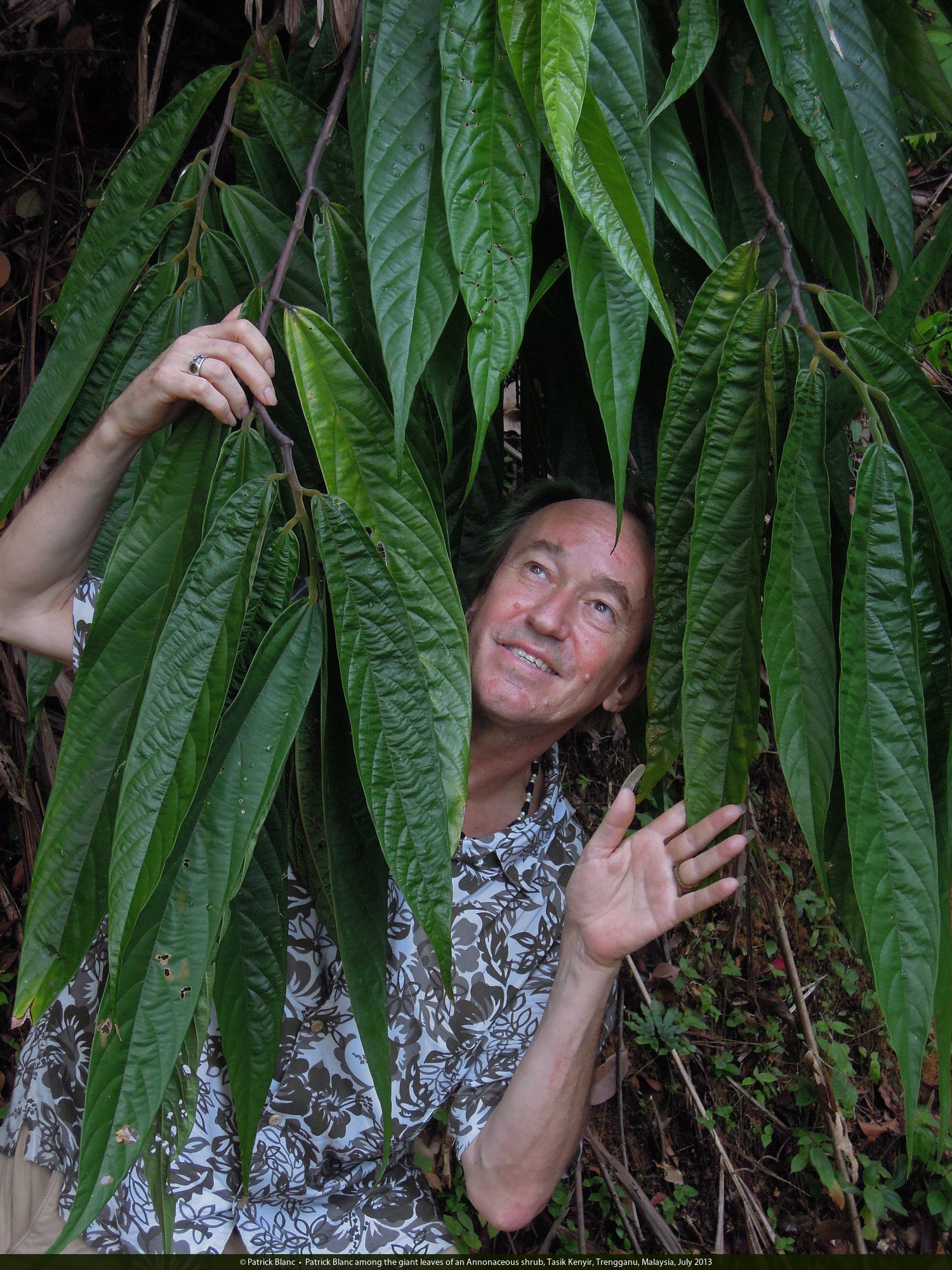 Patrick Blanc among the giant leaves of an Annonaceous shrub, Tasik Kenyir, Trengganu, Malaysia, July 2013