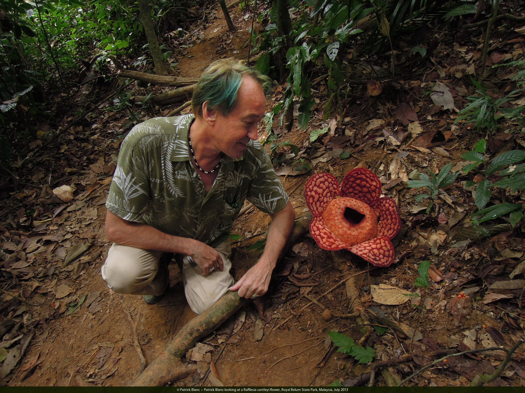 Patrick Blanc looking at a Rafflesia cantleyi flower, Royal Belum State Park, Malaysia, July 2013