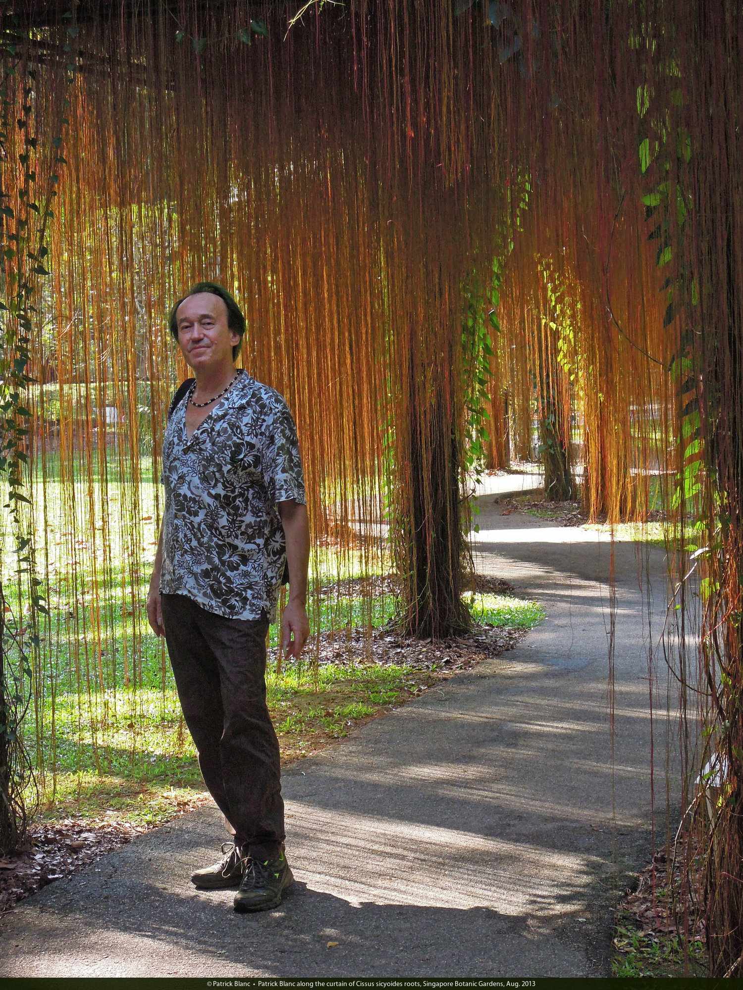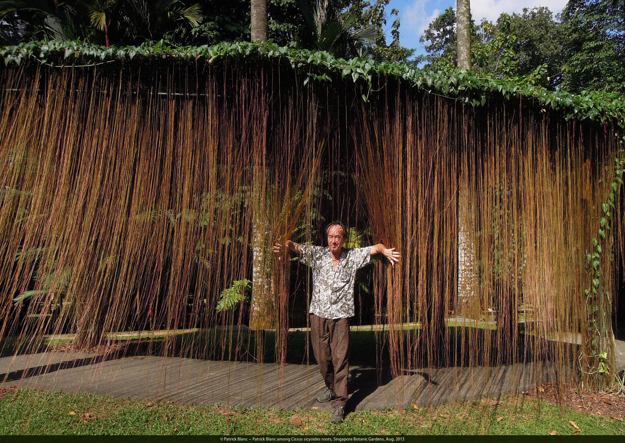Patrick Blanc along the curtain of Cissus verticillata (syn. C. sicyoides) roots, Singapore Botanic Gardens, Aug. 2013