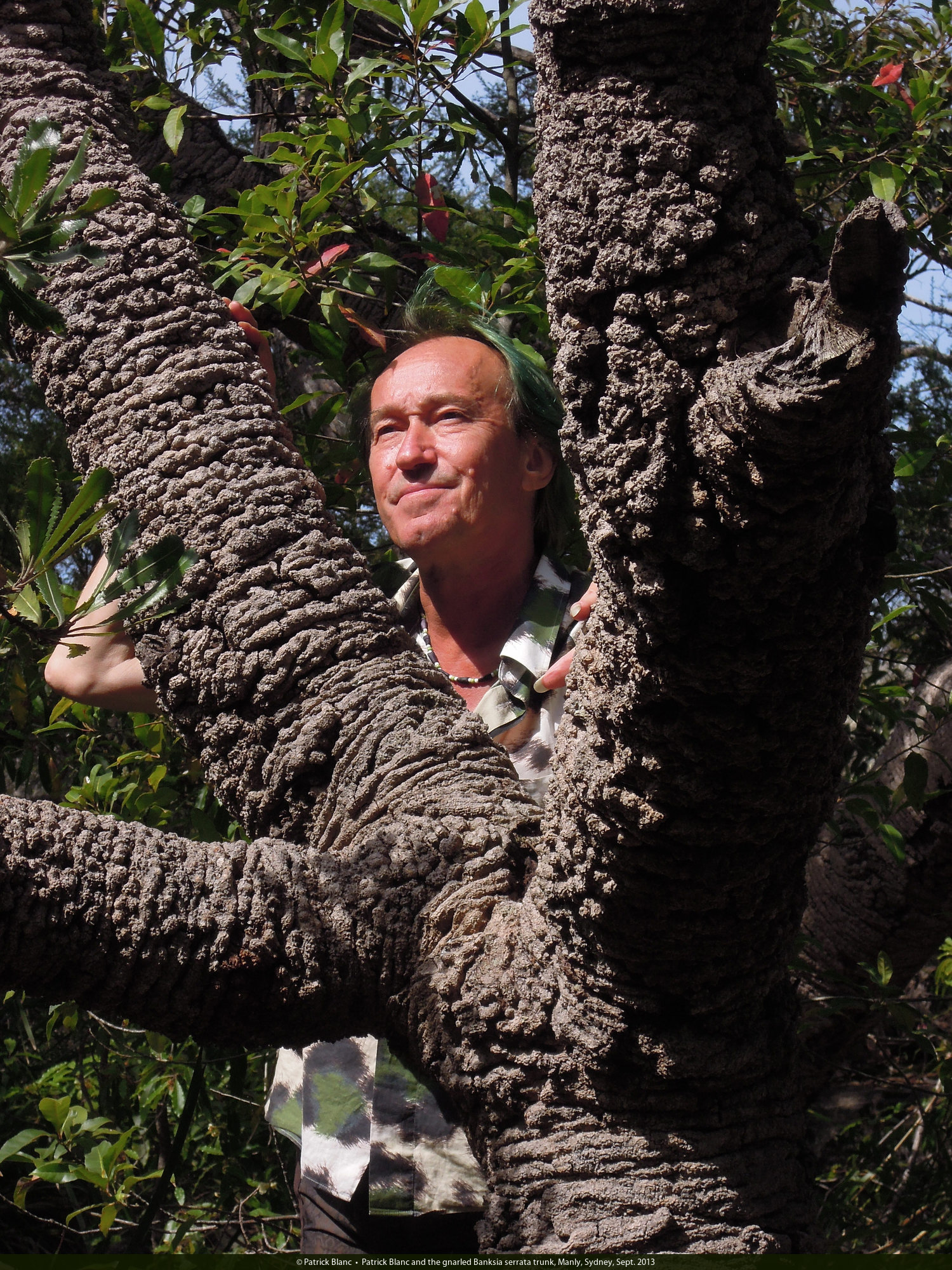 Patrick Blanc and the gnarled Banksia serrata trunk, Manly, Sydney, Sept. 2013