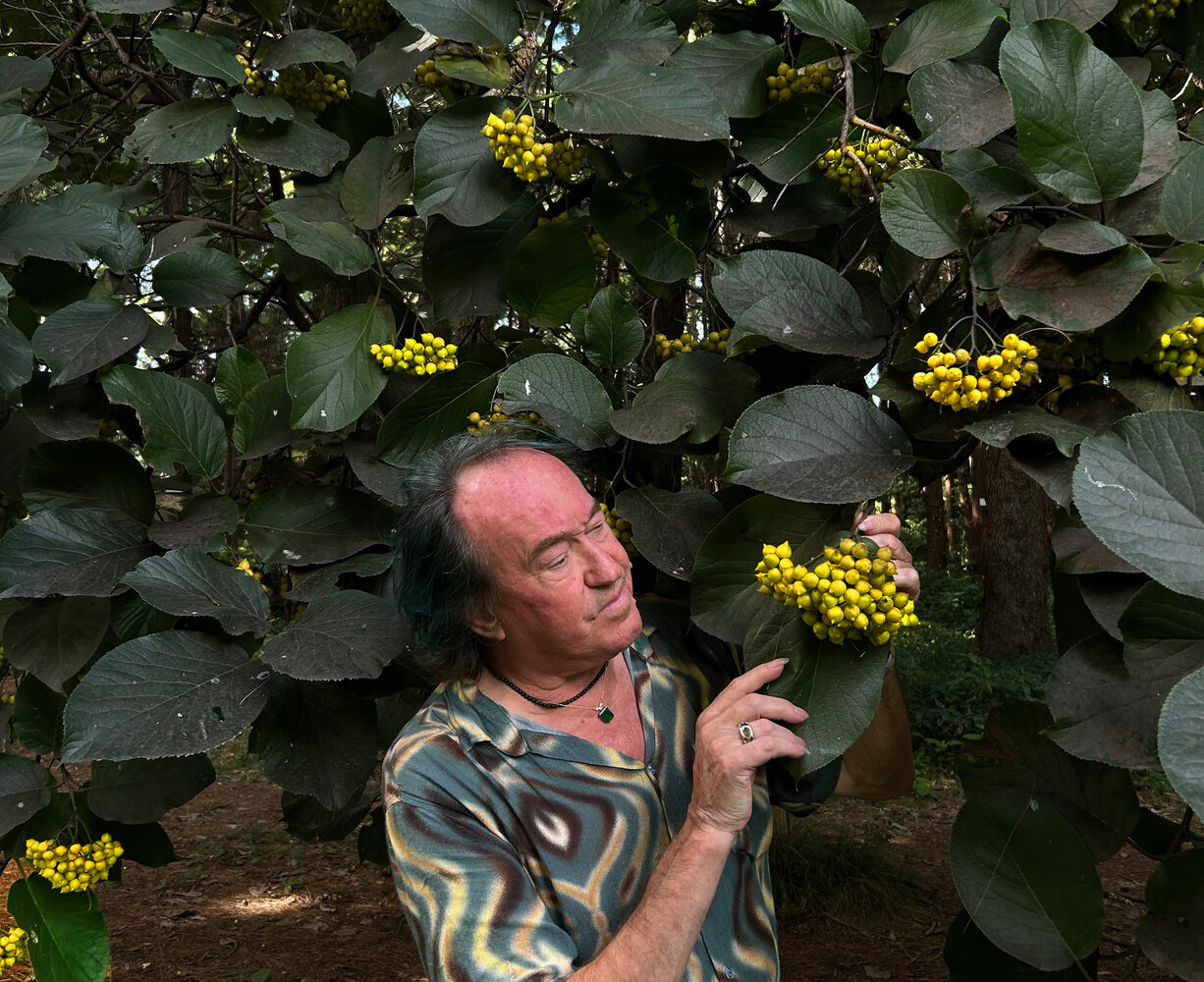 • Patrick Blanc much intrigued by the bright yellow fruits of Ehretia dicksonii, Koishikawa Botanical Gardens, Tokyo, Oct. 2025
